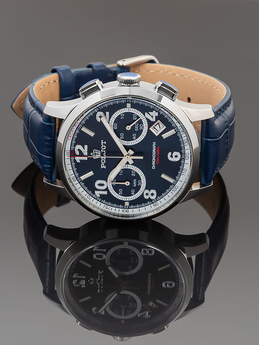 Poljot 6S21.901214 — современные мужские часы с выразительным спортивным дизайном и надёжной функциональностью. Корпус из нержавеющей стали подчёркивает прочность и уверенный характер модели, а глубокий циферблат с счётчиками хронографаХронографФункция позволяет измерять отрезки времени с особой точностью: часы, минуты, секунды. Верным признаком хронографа является наличие на циферблате 3 дополнительных окошек-счётчиков. и аккуратным окном даты придаёт часам динамичный вид. Контрастные стрелки и метки с люминесцентным покрытиемЛюминесцентное покрытиеПозволяет считывать показания времени в темноте. Производители наносят на стрелки, часовые индексы, безель или поверхность циферблата светонакопительный состав, дающий холодное свечение. обеспечивают удобство считывания информации в любое время суток, а внешняя шкала тахиметраТахиметрРазмеченная шкала, располагается на ободке или безеле часов. Тахиметр позволяет рассчитать скорость на определённом участке пути, расстояние измеряется в километрах или милях. добавляет спортивную функциональность. Прочное минеральное стеклоМинеральное стеклоМинеральное стекло представляет собой искусственно выращенный минерал кварца. Такое стекло отличается особой устойчивостью к повреждениям и царапинам. Уступает по некоторым качествам сапфировому стеклу. защищает циферблат от царапин, а ремешок из натуральной кожи гарантирует комфорт и элегантную посадку на запястье. Poljot — это гармония классики и спортивного духа, созданная для мужчин, ценящих точность, надёжность и уверенный стиль.