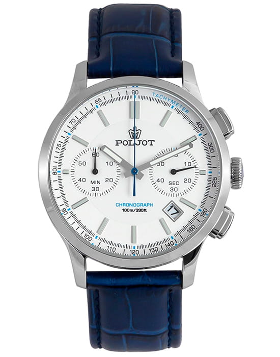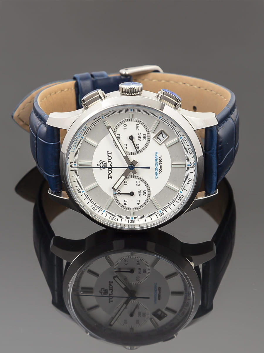 Poljot 6S21.901218 — современные мужские часы с выразительным спортивным дизайном и надёжной функциональностью. Корпус из нержавеющей стали подчёркивает прочность и уверенный характер модели, а глубокий циферблат с счётчиками хронографаХронографФункция позволяет измерять отрезки времени с особой точностью: часы, минуты, секунды. Верным признаком хронографа является наличие на циферблате 3 дополнительных окошек-счётчиков. и аккуратным окном даты придаёт часам динамичный вид. Контрастные стрелки и метки с люминесцентным покрытиемЛюминесцентное покрытиеПозволяет считывать показания времени в темноте. Производители наносят на стрелки, часовые индексы, безель или поверхность циферблата светонакопительный состав, дающий холодное свечение. обеспечивают удобство считывания информации в любое время суток, а внешняя шкала тахиметраТахиметрРазмеченная шкала, располагается на ободке или безеле часов. Тахиметр позволяет рассчитать скорость на определённом участке пути, расстояние измеряется в километрах или милях. добавляет спортивную функциональность. Прочное минеральное стеклоМинеральное стеклоМинеральное стекло представляет собой искусственно выращенный минерал кварца. Такое стекло отличается особой устойчивостью к повреждениям и царапинам. Уступает по некоторым качествам сапфировому стеклу. защищает циферблат от царапин, а ремешок из натуральной кожи гарантирует комфорт и элегантную посадку на запястье. Poljot — это гармония классики и спортивного духа, созданная для мужчин, ценящих точность, надёжность и уверенный стиль.