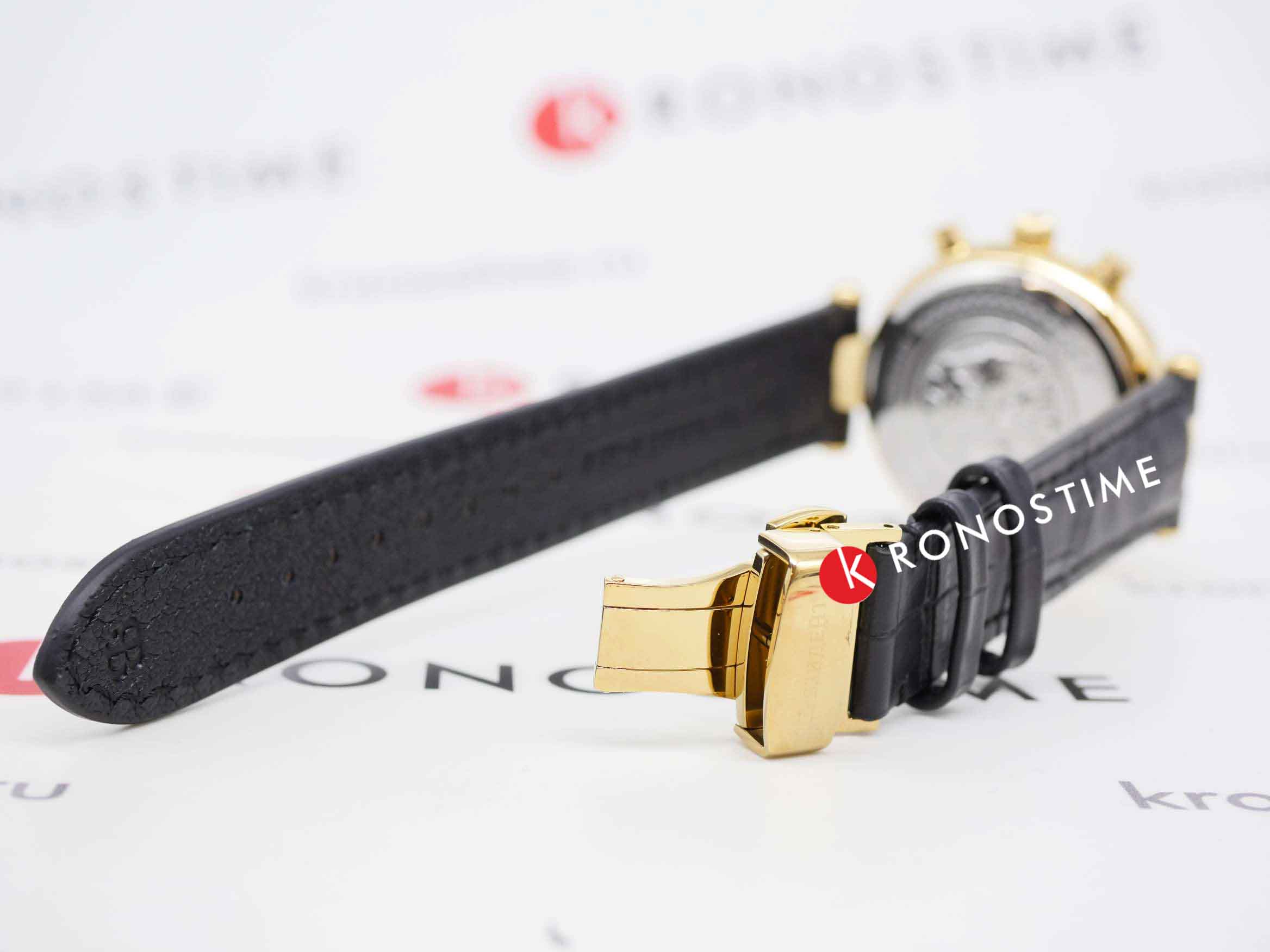 Часы «Президент» модели 14446204 — это мужские кварцевые наручные часы с хронографом, сочетающие классический дизайн и функциональность. Механизм: кварцевый хронограф Miyota OS21, обеспечивающий точность и надёжность. Функции: часы, минуты, секунды, дата, хронограф (секундомер). Корпус: из нержавеющей стали с PVD-покрытиемPVDУльтратонкое покрытие наносится в технике вакуумного напыления, сочетает в себе нитрид титана особой прочности со слоем золота или оксида хрома. Несёт в себе декоративную или защитную функцию. цвета жёлтого золота, диаметр 42,5 мм, толщина 14 мм. Циферблат: белый с позолоченными римскими цифрами, придающими элегантный вид. Стекло: сапфировое стеклоСапфировое стеклоПрочный и надёжный материал из кристалла сапфира синтетического происхождения, характеризующийся особой твёрдостью и устойчивостью к царапинам и повреждениям., устойчивое к царапинам. Водонепроницаемость: 5 ATM (50 метров), что позволяет использовать часы при мытье рук и в дождливую погоду. Ремешок: кожаный, шириной 20 мм, с классической застёжкой. Эти часы — идеальный выбор для деловых людей, ценящих стиль и функциональность.