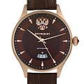 Мужские часы из коллекции «Президент» — это воплощение респектабельности и классического стиля. Модель выполнена в круглой форме с корпусом диаметром 42,2 мм и толщиной 13,8 мм, защищённым минеральным стекломМинеральное стеклоМинеральное стекло представляет собой искусственно выращенный минерал кварца. Такое стекло отличается особой устойчивостью к повреждениям и царапинам. Уступает по некоторым качествам сапфировому стеклу., устойчивым к мелким механическим повреждениям. Цвет корпуса — розовое золото, что придаёт модели благородный внешний вид и подчёркивает её уникальность. Часы оснащены функцией отображения даты и прозрачной задней крышкой, через которую можно наблюдать за работой механизма. На циферблате инкрустированы кристаллы Swarovski, добавляющие модели изысканности и блеска. Браслет коричневого цвета выполнен из натуральной кожи, а его ширина составляет 20 мм, что делает модель удобной и элегантной на запястье. Механизм с автоподзаводом обеспечивает надёжную работу и точность хода. Часы водонепроницаемы до 30 метров (), что позволяет использовать их в повседневных условиях — при мытье рук или под лёгким дождём. Эти часы станут универсальным аксессуаром для тех, кто ценит сочетание стиля, качества и эстетики — идеальный выбор для уверенных в себе мужчин, следящих за своим имиджем и предпочитающих выделяться.