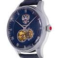 Мужские часы из коллекции «Президент» — это классический аксессуар, сочетающий в себе элегантность и надёжность. Модель выполнена в круглой форме с корпусом диаметром 42,5 мм и толщиной 16,3 мм, защищённым минеральным стекломМинеральное стеклоМинеральное стекло представляет собой искусственно выращенный минерал кварца. Такое стекло отличается особой устойчивостью к повреждениям и царапинам. Уступает по некоторым качествам сапфировому стеклу., устойчивым к мелким повреждениям. Браслет синего цвета изготовлен из натуральной кожи и дополнен стандартной застёжкой, что делает его удобным и практичным для повседневного использования. Часы оснащены механизмом с автоподзаводом, обеспечивающим точность хода и минимальное обслуживание. Прозрачная задняя крышка украшена изображением Герба России, что подчёркивает национальную принадлежность и уникальность модели. Водонепроницаемость позволяет использовать модель в повседневных условиях — при мытье рук или под лёгким дождём. Эти часы станут универсальным аксессуаром для тех, кто ценит сочетание стиля, качества и символики — идеальный выбор для уверенных в себе мужчин, следящих за своим имиджем и предпочитающих выделяться.