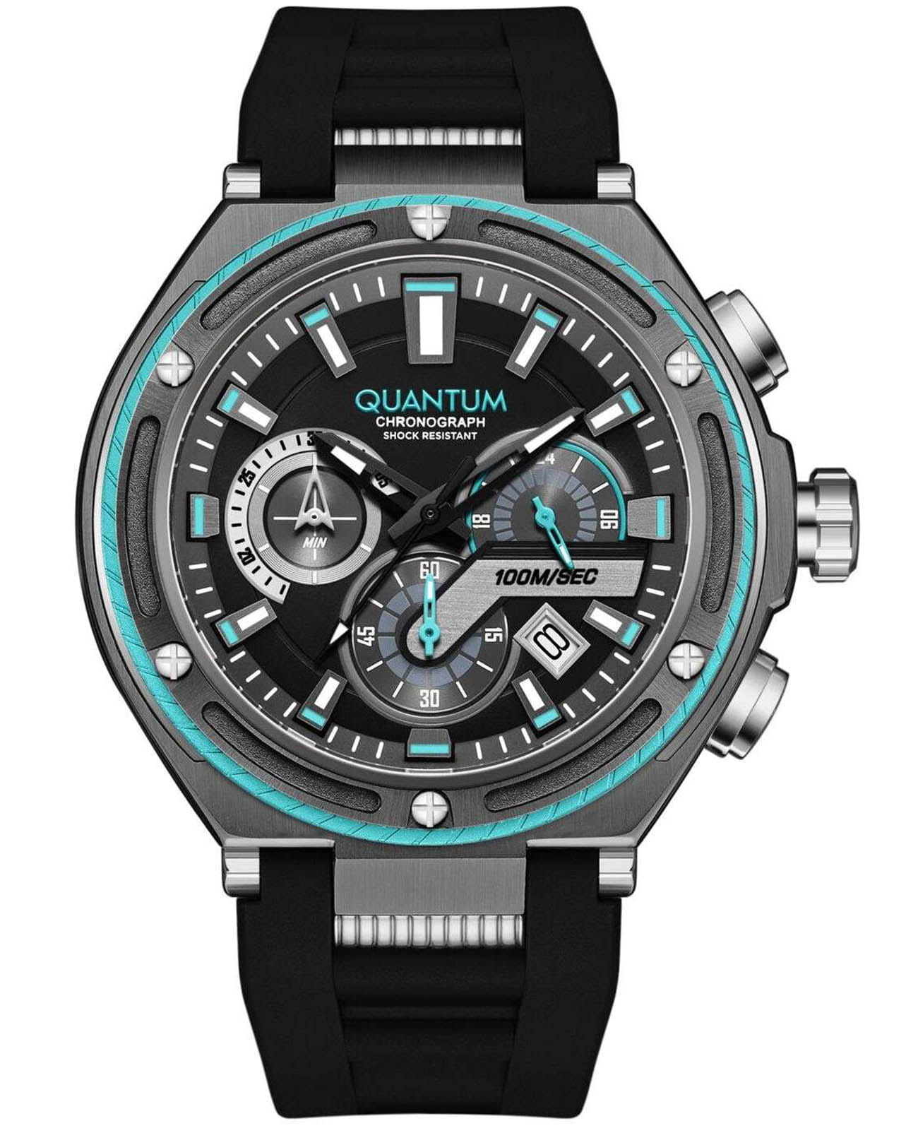 Мужские кварцевые часы Quantum HNG1010.061 из коллекции Hunter — мощный спортивный аксессуар с функцией хронографа и повышенной надёжностью. Корпус круглый, из нержавеющей стали с PVD-покрытиемPVDУльтратонкое покрытие наносится в технике вакуумного напыления, сочетает в себе нитрид титана особой прочности со слоем золота или оксида хрома. Несёт в себе декоративную или защитную функцию., диаметром 50 мм. Циферблат — чёрный с функциями хронографаХронографФункция позволяет измерять отрезки времени с особой точностью: часы, минуты, секунды. Верным признаком хронографа является наличие на циферблате 3 дополнительных окошек-счётчиков., даты и секундомера. Стекло — минеральноеМинеральное стеклоМинеральное стекло представляет собой искусственно выращенный минерал кварца. Такое стекло отличается особой устойчивостью к повреждениям и царапинам. Уступает по некоторым качествам сапфировому стеклу. с антибликовым покрытием. Механизм — японский кварцевый Seiko. Водонепроницаемость 100 м. Корпус — ударопрочныйУдаропрочный корпусМеханизм заключён в корпус, выполненный из современных материалов, устойчивых к ударам, механическим повреждениям и падению с высоты: инновационный пластик, карбон, нержавеющая сталь, титан.. Ремешок — чёрный силиконовый на стандартной застёжке. Идеальный выбор для тех, кто ценит турецкий дизайн и активный образ жизни.
