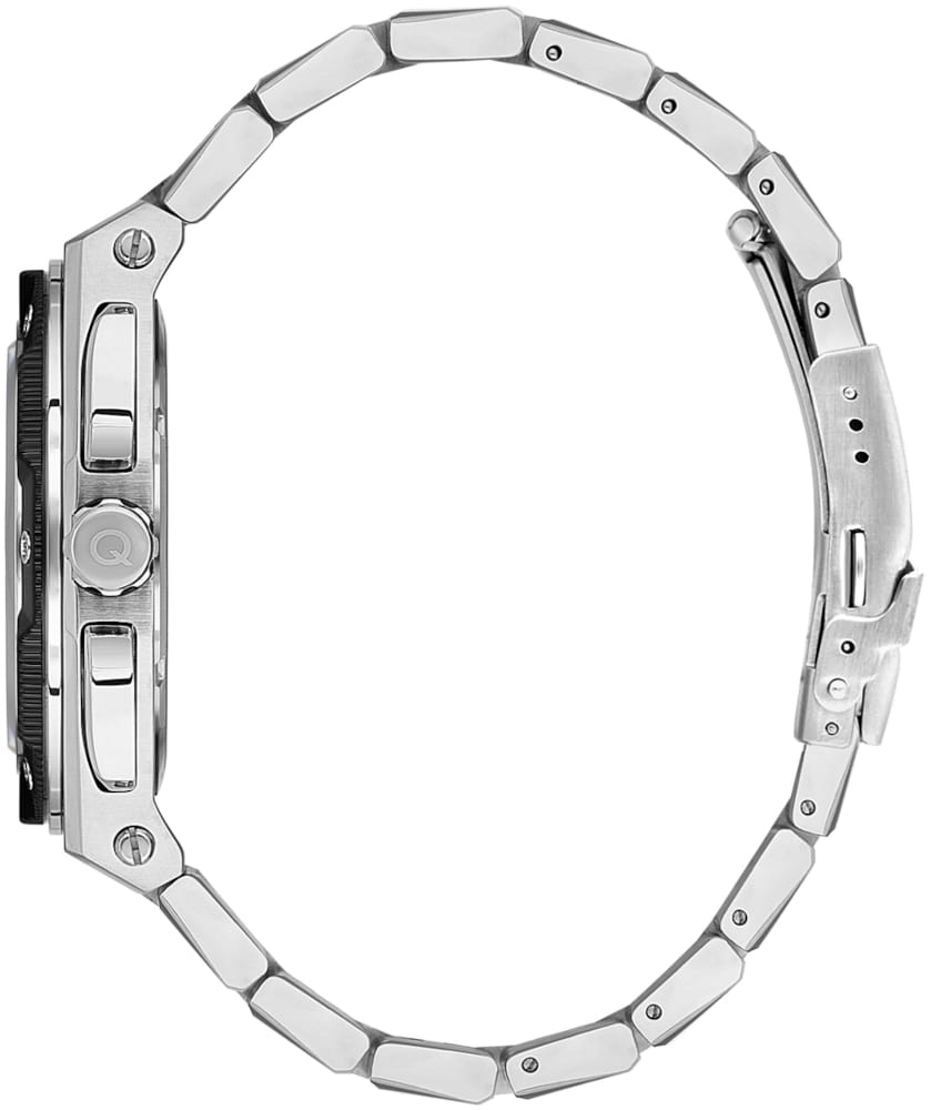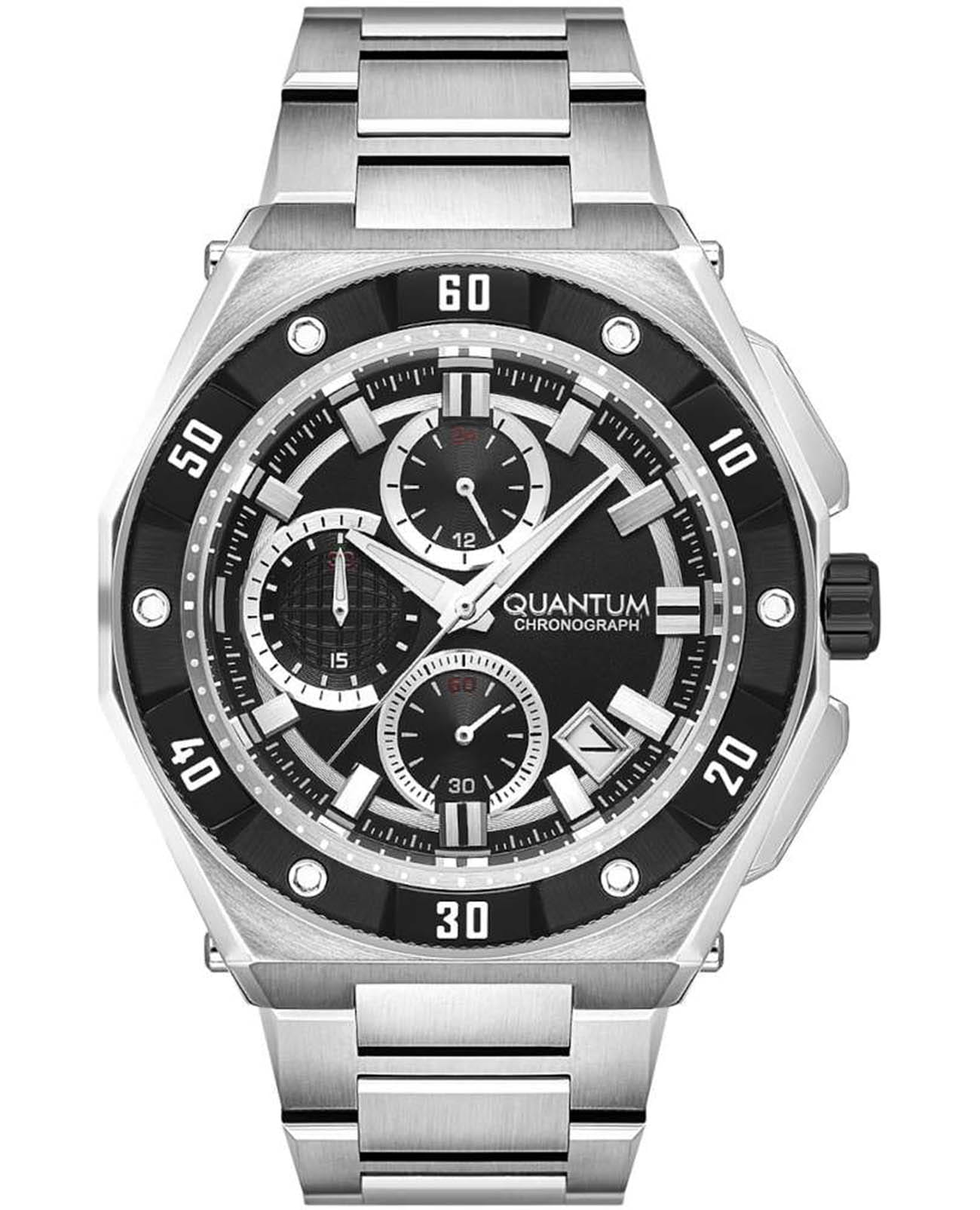 Мужские кварцевые часы Quantum HNG1011.350 — надёжный и функциональный аксессуар для повседневного ношения и активного отдыха. Корпус круглый, из нержавеющей стали, диаметром 46 мм. БезельБезельВнешний ободок, закрепляющий стекло. В спортивных часах так называется поворотное кольцо с делениями на циферблате, выполняет роль таймера – замеряет отрезки времени на шкале. Неподвижный безель – элемент декора. Однонаправленно вращающийся безель на дайверских часах позволяет фиксировать моменты погружения и выныривания на поверхность. из нержавеющей стали с PVD-покрытиемPVDУльтратонкое покрытие наносится в технике вакуумного напыления, сочетает в себе нитрид титана особой прочности со слоем золота или оксида хрома. Несёт в себе декоративную или защитную функцию.. Циферблат — чёрный со штриховыми метками и окошком даты. Стекло — минеральноеМинеральное стеклоМинеральное стекло представляет собой искусственно выращенный минерал кварца. Такое стекло отличается особой устойчивостью к повреждениям и царапинам. Уступает по некоторым качествам сапфировому стеклу. с антибликовым покрытием. Часы оснащены хронографомХронографФункция позволяет измерять отрезки времени с особой точностью: часы, минуты, секунды. Верным признаком хронографа является наличие на циферблате 3 дополнительных окошек-счётчиков.. Стрелки и метки с люминесцентным покрытиемЛюминесцентное покрытиеПозволяет считывать показания времени в темноте. Производители наносят на стрелки, часовые индексы, безель или поверхность циферблата светонакопительный состав, дающий холодное свечение.. Механизм японский кварцевый Seiko. Водонепроницаемость 100 м. Браслет — стальной на раскладной застёжкеРаскладная застёжкаТакой тип застёжки используется только на браслетах из металла. Она никогда не раскрывается полностью, происходит разделение на 2 и более частей. Раскладывающая застёжка снизит вероятность потери часов к минимуму.. Идеальный выбор для тех, кто ценит турецкий дизайн и практичность в классическом исполнении.