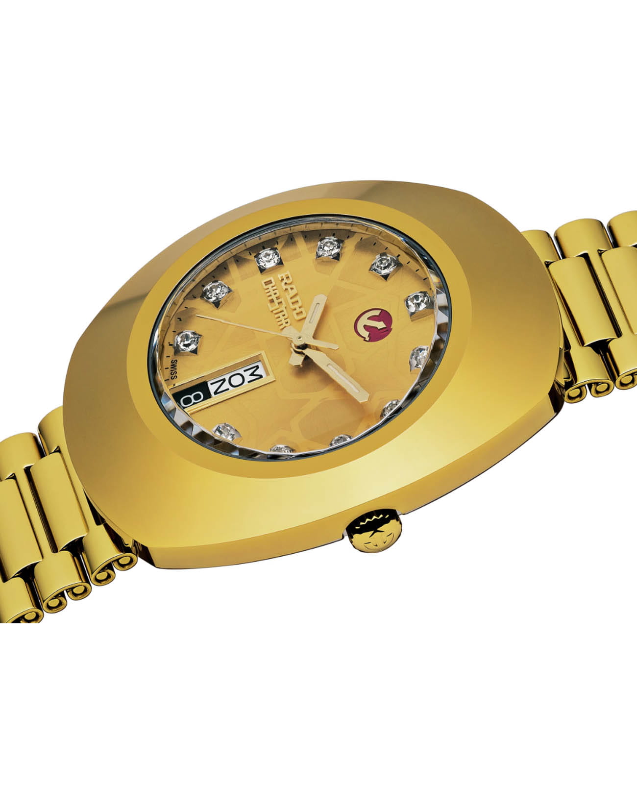 Мужские часы Rado The Original Automatic R12413503 с надёжным автоматическим механизмом. Корпус и браслет часов выполнены из нержавеющей стали c PVD-покрытиемPVDУльтратонкое покрытие наносится в технике вакуумного напыления, сочетает в себе нитрид титана особой прочности со слоем золота или оксида хрома. Несёт в себе декоративную или защитную функцию.. Стальной браслет на раскладной застёжкеРаскладная застёжкаТакой тип застёжки используется только на браслетах из металла. Она никогда не раскрывается полностью, происходит разделение на 2 и более частей. Раскладывающая застёжка снизит вероятность потери часов к минимуму.. Класс водозащиты: 30 метров, позволит защитить корпус от случайных брызг или капель дождя. Циферблат с узорами инкрустирован сапфирами. Окошко даты и дня недели находится в положении 6 часов. Стрелки и метки с люминесцентным покрытиемЛюминесцентное покрытиеПозволяет считывать показания времени в темноте. Производители наносят на стрелки, часовые индексы, безель или поверхность циферблата светонакопительный состав, дающий холодное свечение..