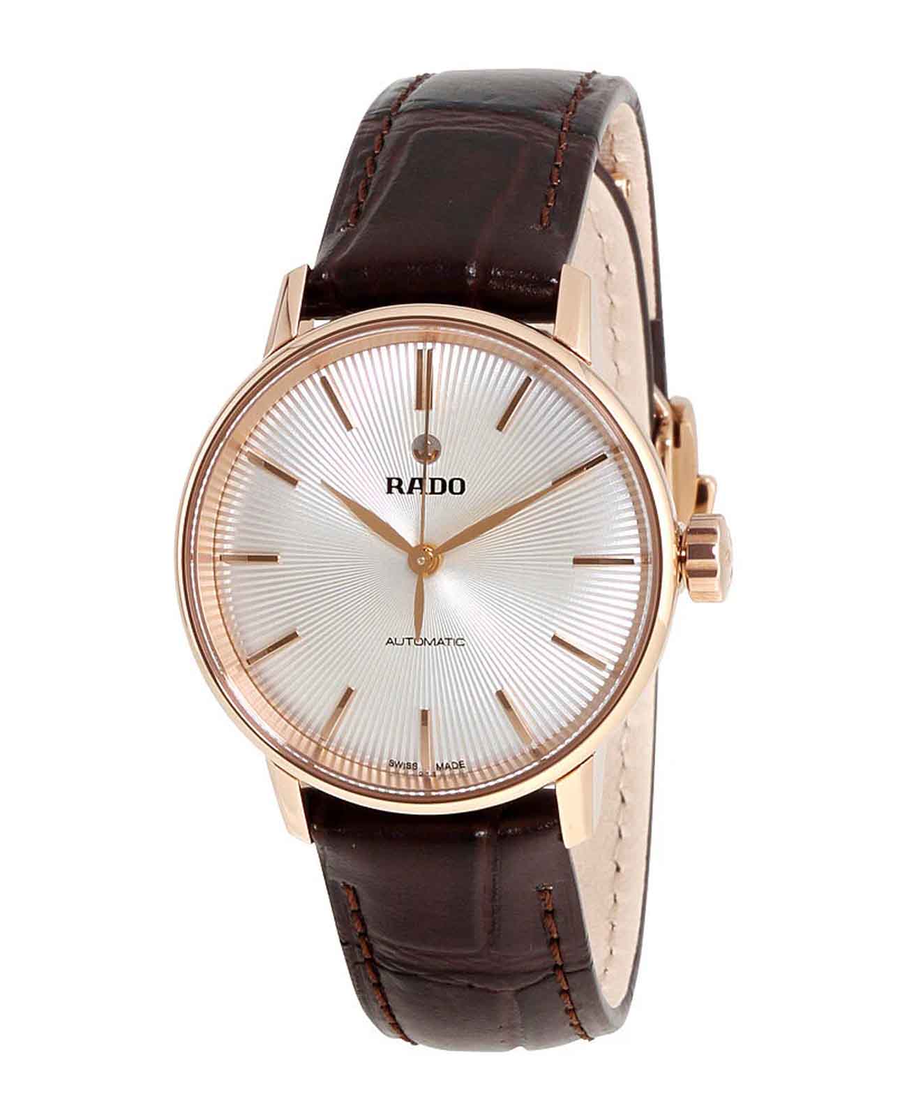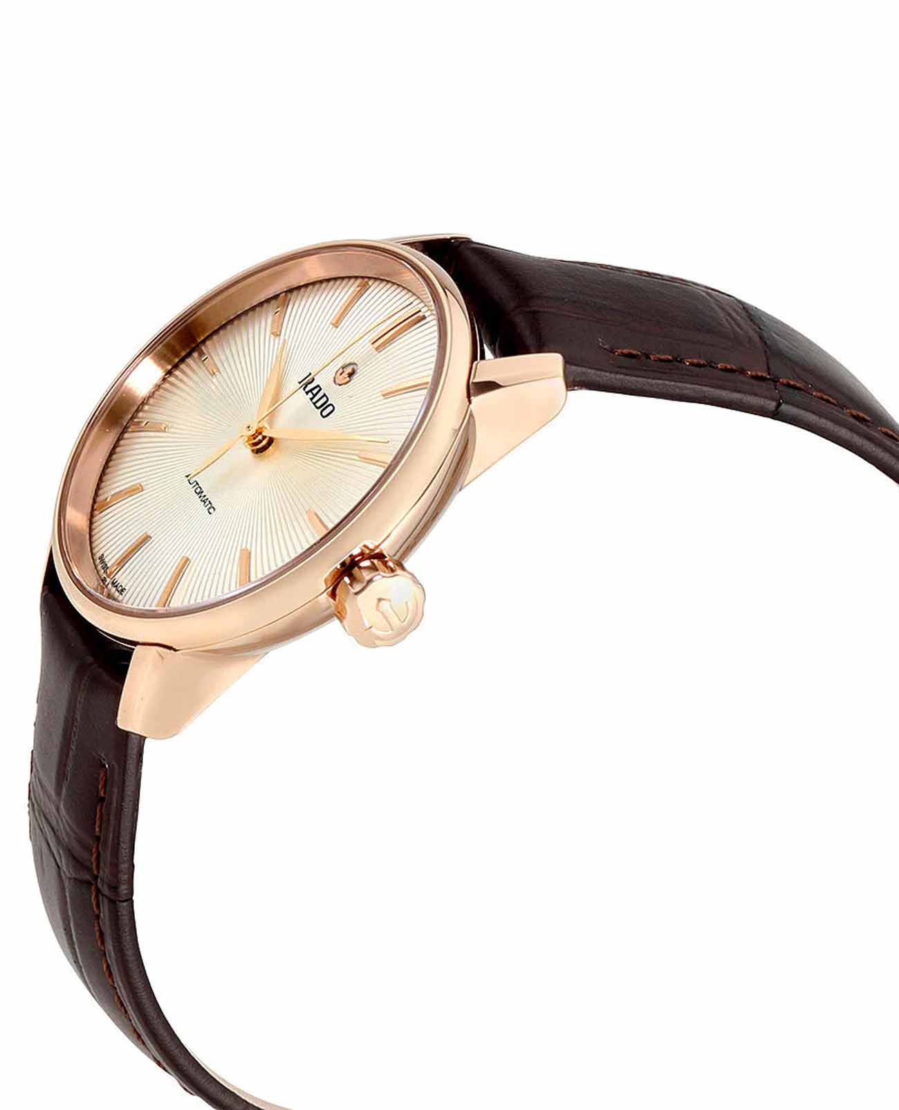 Женские механические швейцарские часы с автоподзаводом Rado Coupole Classic Automatic R22865115. Сапфировое стеклоСапфировое стеклоПрочный и надёжный материал из кристалла сапфира синтетического происхождения, характеризующийся особой твёрдостью и устойчивостью к царапинам и повреждениям. устойчивое к мелким механическим повреждениям. Корпус часов изготовлен из нержавеющей стали с PVD-покрытиемPVDУльтратонкое покрытие наносится в технике вакуумного напыления, сочетает в себе нитрид титана особой прочности со слоем золота или оксида хрома. Несёт в себе декоративную или защитную функцию.. Класс водозащиты: 50 метров, позволит защитить корпус от случайных брызг или капель дождя. Кожаный ремешок на раскладной застёжкеРаскладная застёжкаТакой тип застёжки используется только на браслетах из металла. Она никогда не раскрывается полностью, происходит разделение на 2 и более частей. Раскладывающая застёжка снизит вероятность потери часов к минимуму..