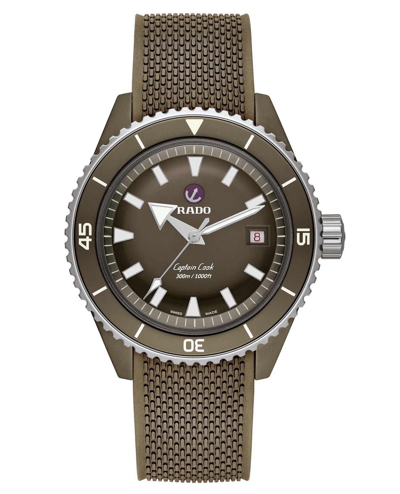Высокотехнологичные керамические часы Captain Cook для дайверов (300 WR). Стрелки и индексы дайверских часов, сертифицированных по стандарту ISO 6425, покрыты SuperLuminova®, что обеспечивает отличную видимость на матовом оливково-зеленом циферблате. 43-миллиметровый моноблочный корпус изготовлен из матовой оливково-зеленой высокотехнологичной керамикиВысокотехнологичная керамикаИнновационный запатентованный Rado материал с гладкой или матовой поверхностью. Керамика за счёт кристаллической структуры обладает повышенной устойчивостью от возникновения царапин. Материал способен принимать температуру тела человека, обеспечивая невероятный комфорт при ношении., а вращающийся безельБезельВнешний ободок, закрепляющий стекло. В спортивных часах так называется поворотное кольцо с делениями на циферблате, выполняет роль таймера – замеряет отрезки времени на шкале. Неподвижный безель – элемент декора. Однонаправленно вращающийся безель на дайверских часах позволяет фиксировать моменты погружения и выныривания на поверхность. - из полированной нержавеющей стали. Внутри механизм Rado R763 с автоподзаводом превосходит стандартные требования по проверке точности в 3-5 положениях и обеспечивает 80 часов запаса хода. Эта модель поставляется с матовым каучуковым ремешком оливково-зеленого цвета. Какой бы ни была ваша область исследований, ваш высокотехнологичный керамический дайвер Captain Cook станет надежным партнером на долгие годы.