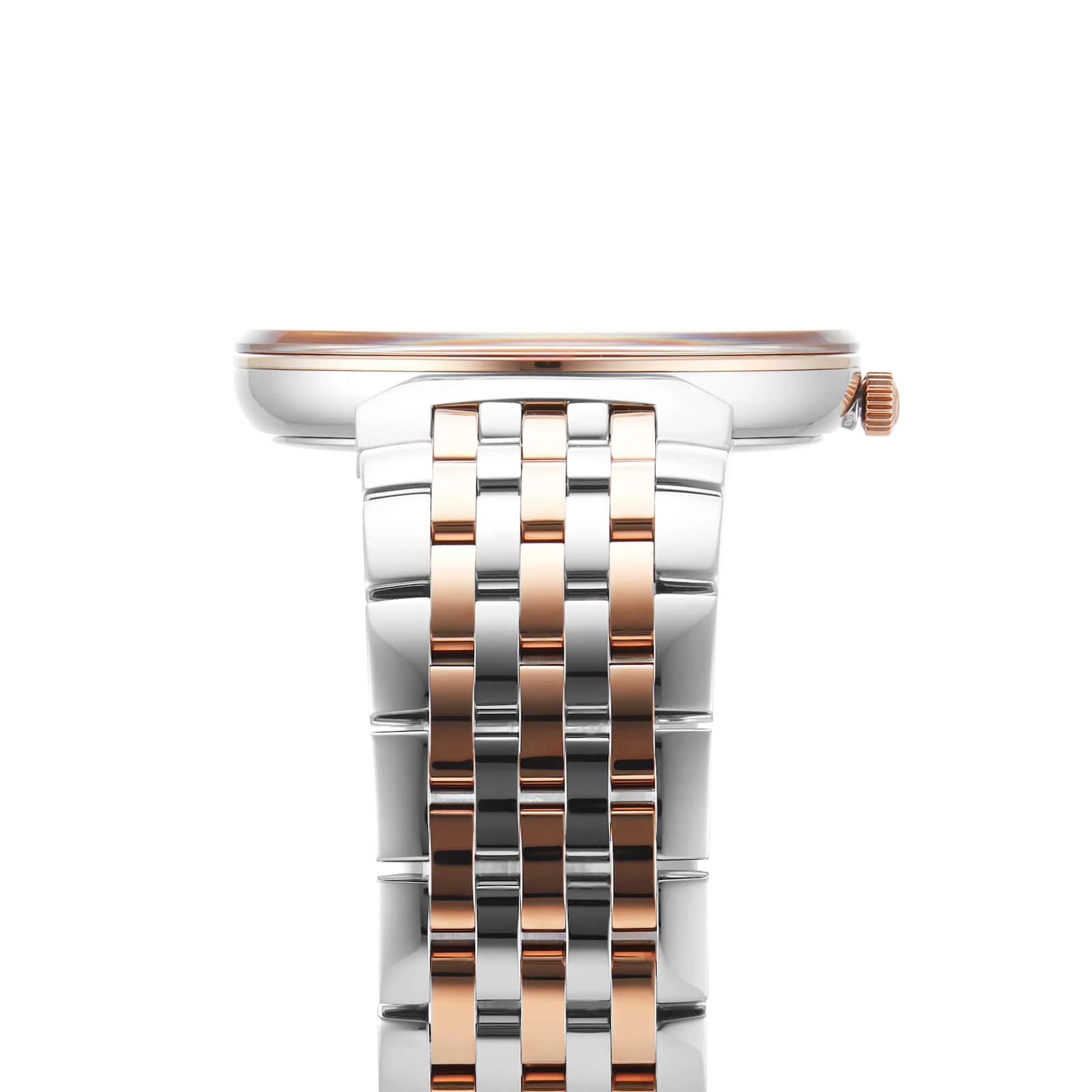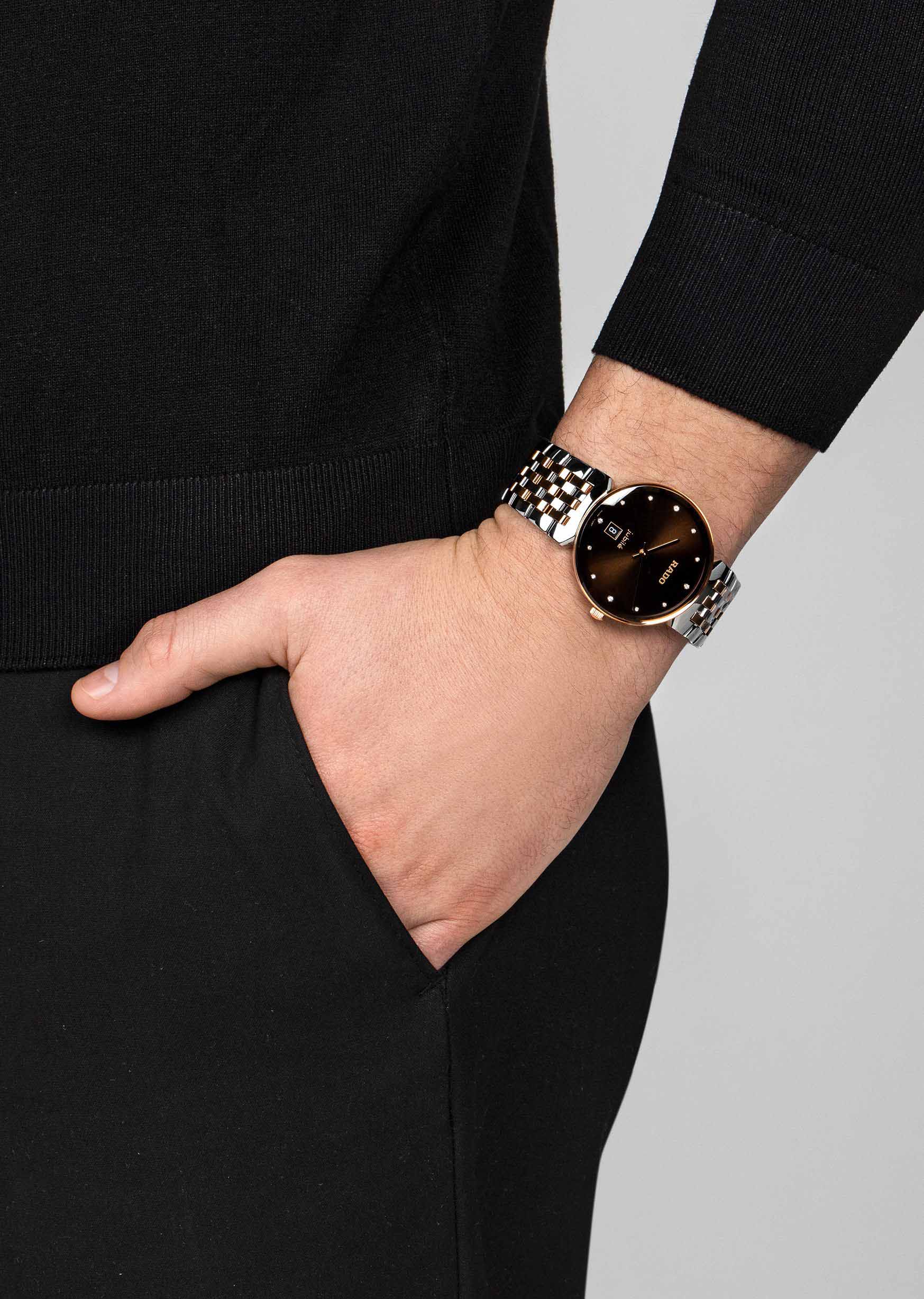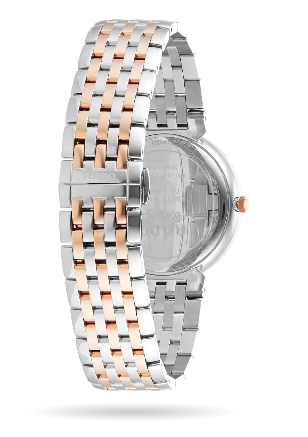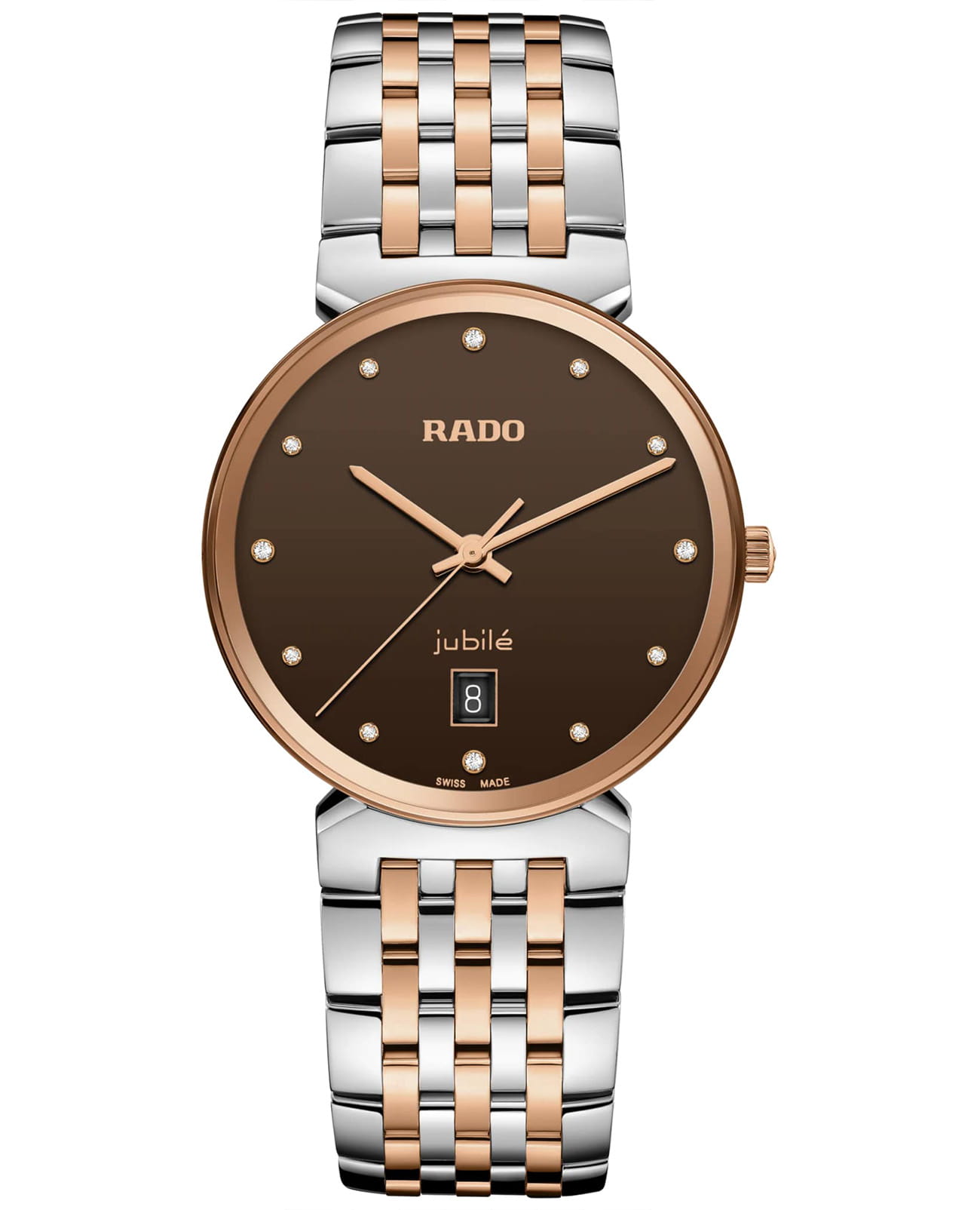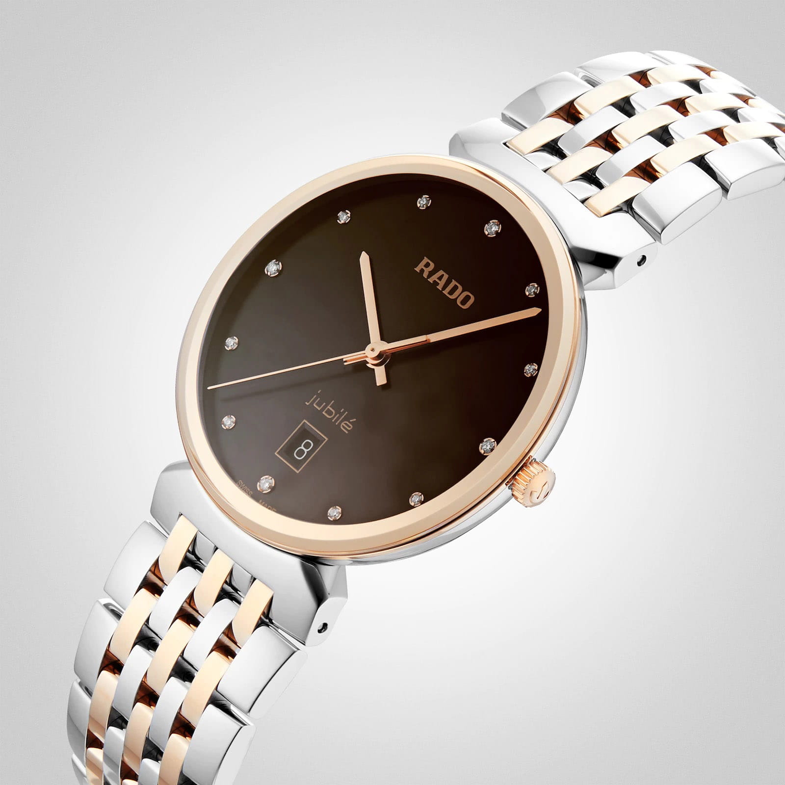Гармоничный дизайн часов Rado Florence Classic напоминает об элегантных куполах и башнях города, в честь которого названа коллекция. Часы диаметром 38 мм имеют изогнутое сапфировое стеклоСапфировое стеклоПрочный и надёжный материал из кристалла сапфира синтетического происхождения, характеризующийся особой твёрдостью и устойчивостью к царапинам и повреждениям. со скошенными краями. Браслет из полированной нержавеющей стали со средними звеньями цвета розового золота с PVDPVDУльтратонкое покрытие наносится в технике вакуумного напыления, сочетает в себе нитрид титана особой прочности со слоем золота или оксида хрома. Несёт в себе декоративную или защитную функцию. покрытием завершает общий вид этих классических часов. Коричневый циферблат с солнечными лучами, украшенный 12 бриллиантами и украшенный печатным логотипом «jubilé», идеально сочетается со стрелками цвета розового золота. Благодаря кварцевому механизму калибра R073 с тремя стрелками часы обладают большей точностью и устойчивостью к ударам. Часы водонепроницаемы на глубине до 50 м, а также доступны в размере S, что делает их идеальными часами для пар.