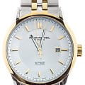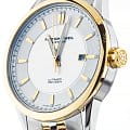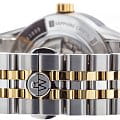Двухцветный браслет из нержавеющей стали с жёлтым PVD-покрытиемPVDУльтратонкое покрытие наносится в технике вакуумного напыления, сочетает в себе нитрид титана особой прочности со слоем золота или оксида хрома. Несёт в себе декоративную или защитную функцию. и застёжке-бабочке с кнопкамиЗастёжка "бабочка"Такой вид застёжки дополняется предохранителями, помогающими избежать случайного раскрытия браслета. Обладают изящным исполнением. обеспечивает комфортное ношение и надёжную фиксацию. Водозащита до 10 ATM делает часы подходящими для плавания и других водных активностей.