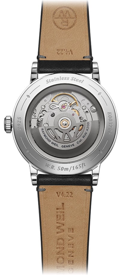 Raymond Weil Millesime — мужские автоматические часы для ценителей элегантности и швейцарского мастерства. Идеальное сочетание утончённого дизайна и функциональности для динамичного образа жизни. Ключевые особенности: Швейцарский автоматический механизм с запасом хода 38 часов и W-образным ротором, демонстрирующимся через сапфировое стеклоСапфировое стеклоПрочный и надёжный материал из кристалла сапфира синтетического происхождения, характеризующийся особой твёрдостью и устойчивостью к царапинам и повреждениям. на задней крышке. Циферблат с метками в виде штрихов, выполненный в лаконичном стиле, защищён сапфировым стекломСапфировое стеклоПрочный и надёжный материал из кристалла сапфира синтетического происхождения, характеризующийся особой твёрдостью и устойчивостью к царапинам и повреждениям., устойчивым к царапинам и ударам. Эргономичная заводная головка с гравировкой логотипа RW подчеркивает внимание к деталям. Кожаный ремешок с классической застёжкой обеспечивает комфорт и универсальность ношения. Дизайн и детали: Строгий круглый корпус из с минималистичными линиями и полированной отделкой. Прозрачная задняя крышка с сапфировым стеклом (сапфировое стеклоСапфировое стеклоПрочный и надёжный материал из кристалла сапфира синтетического происхождения, характеризующийся особой твёрдостью и устойчивостью к царапинам и повреждениям.) позволяет наблюдать за работой механизма. Тонкий профиль и сдержанная цветовая гамма делают часы уместными как с деловым костюмом, так и с повседневной одеждой. Raymond Weil Millesime — это воплощение швейцарской точности и изысканной простоты. Часы для тех, кто ценит надёжность, элегантность и безупречный стиль.