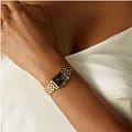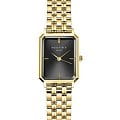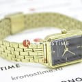 Женские кварцевые часы. Центральные часовая, минутная и секундная стрелки. Черный циферблат. Восьмиугольный корпус выполнен из металла с IP покрытием цвета желтого золота. Размер корпуса составляет 19,5 х 24 мм, толщина 7 мм. Стальной браслет с покрытием, браслетная застежка. Прочное минеральное стекло устойчивое к мелким механическим повреждениям. Водостойкость WR 30 (брызги).