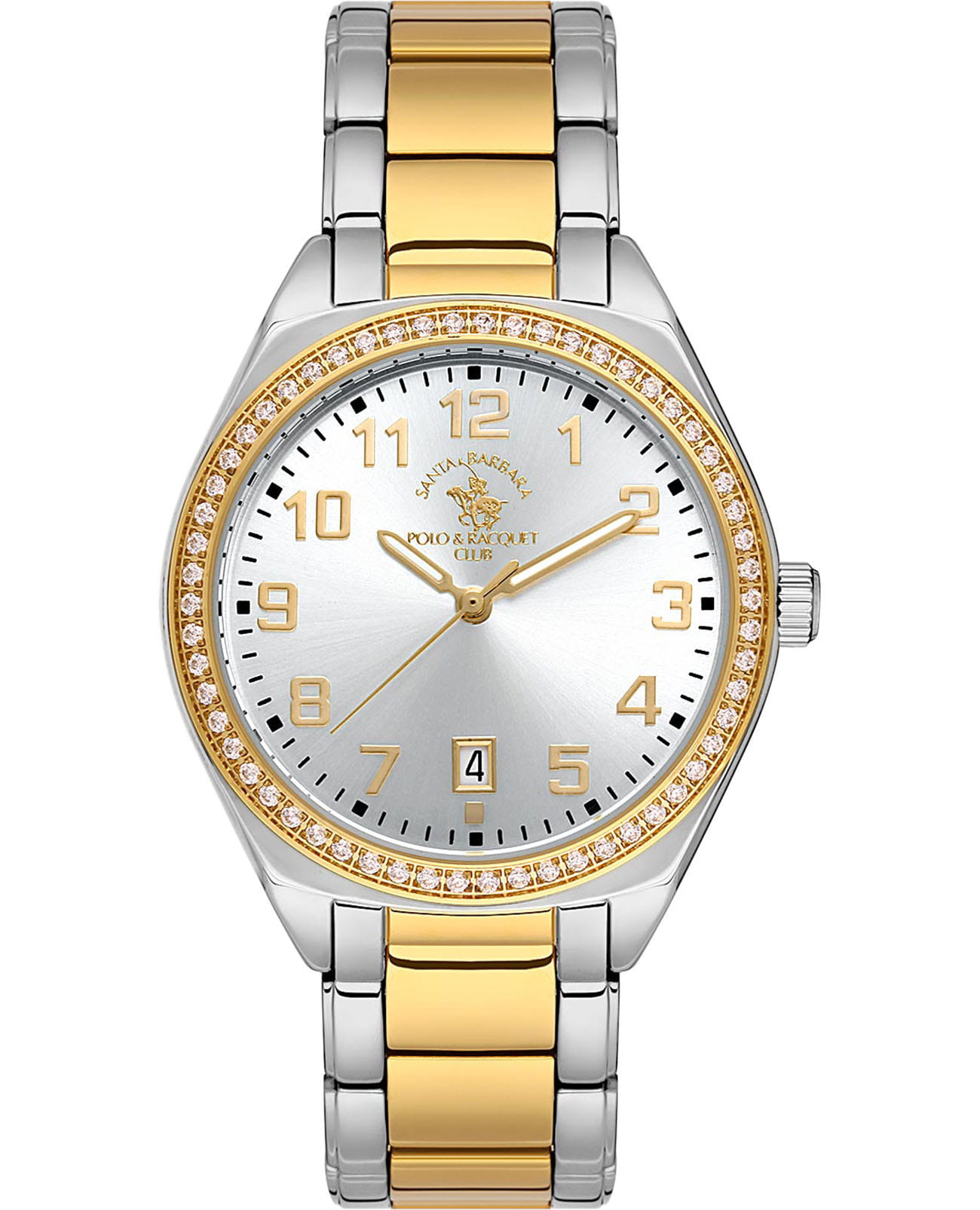 Женские кварцевые часы Santa Barbara Polo & Racquet Club — это стильный и практичный аксессуар. Корпус диаметром 36 мм и высотой 42,5 мм выполнен из латуни. БезельБезельВнешний ободок, закрепляющий стекло. В спортивных часах так называется поворотное кольцо с делениями на циферблате, выполняет роль таймера – замеряет отрезки времени на шкале. Неподвижный безель – элемент декора. Однонаправленно вращающийся безель на дайверских часах позволяет фиксировать моменты погружения и выныривания на поверхность. с IP-покрытиемIP-покрытиеМетод ионного напыления. Демонстрирует повышенную устойчивость к истиранию, окислению и химическим веществам. Под воздействием высокого давления и температуры около 1500°C молекулы металла надёжно соединяются с частицами корпуса часов. украшен кристаллами, придающими изделию изысканный блеск. Циферблат серебристого цвета оформлен по технологии Sunray («солнечные лучи»), дополнен накладными метками в виде штрихов и фирменным логотипом. Окошко даты расположено в положении 6 часов. Стрелки с люминесцентным покрытиемЛюминесцентное покрытиеПозволяет считывать показания времени в темноте. Производители наносят на стрелки, часовые индексы, безель или поверхность циферблата светонакопительный состав, дающий холодное свечение., обеспечивающим хорошую читаемость в темноте. Циферблат защищён минеральным стекломМинеральное стеклоМинеральное стекло представляет собой искусственно выращенный минерал кварца. Такое стекло отличается особой устойчивостью к повреждениям и царапинам. Уступает по некоторым качествам сапфировому стеклу.. Часы оснащены стальным браслетом с IP-покрытиемIP-покрытиеМетод ионного напыления. Демонстрирует повышенную устойчивость к истиранию, окислению и химическим веществам. Под воздействием высокого давления и температуры около 1500°C молекулы металла надёжно соединяются с частицами корпуса часов. и раскладной застёжкойРаскладная застёжкаТакой тип застёжки используется только на браслетах из металла. Она никогда не раскрывается полностью, происходит разделение на 2 и более частей. Раскладывающая застёжка снизит вероятность потери часов к минимуму.. Водонепроницаемость 50 м позволяет использовать часы в повседневных условиях. Идеальный выбор для тех, кто ценит стиль, надёжность и качество.
