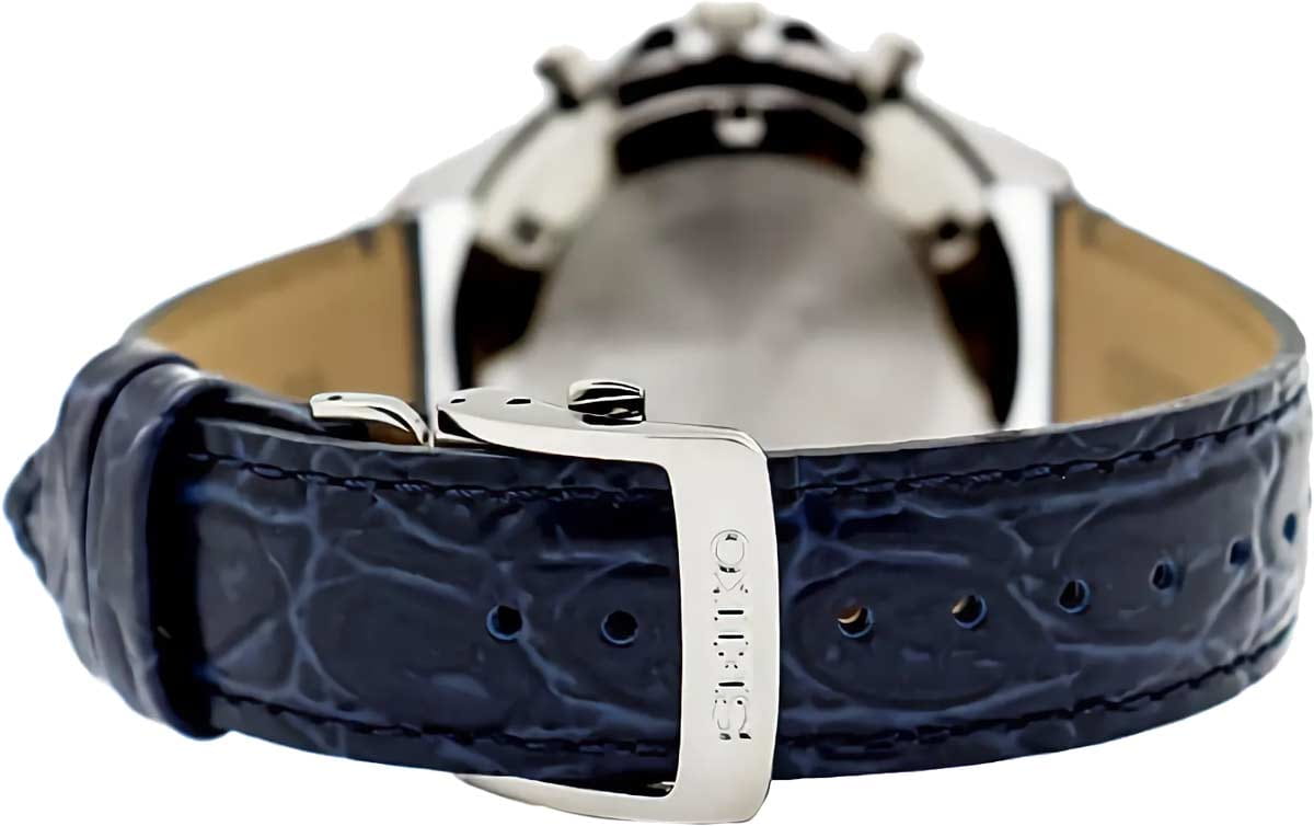 Мужские кварцевые часы-хронограф Seiko из коллекции Spirit — это надёжный и функциональный аксессуар. Корпус диаметром 42 мм выполнен из нержавеющей стали. Циферблат синего цвета выполнен по технологии Sunray («солнечные лучи») и оформлен штрихами. Присутствуют три субциферблата хронографа. Окошко даты расположено между 4 и 5 часами. На циферблате присутствует шкала тахиметраТахиметрРазмеченная шкала, располагается на ободке или безеле часов. Тахиметр позволяет рассчитать скорость на определённом участке пути, расстояние измеряется в километрах или милях.. Стрелки и метки с люминесцентным покрытиемЛюминесцентное покрытиеПозволяет считывать показания времени в темноте. Производители наносят на стрелки, часовые индексы, безель или поверхность циферблата светонакопительный состав, дающий холодное свечение. LumiBrite, обеспечивающим хорошую читаемость в темноте. Циферблат защищён прочным закалённым минеральным стеклом Hardlex. Механизм — японское кварцевое движение калибра 8T63 с функциями хронографаХронографФункция позволяет измерять отрезки времени с особой точностью: часы, минуты, секунды. Верным признаком хронографа является наличие на циферблате 3 дополнительных окошек-счётчиков. и секундомераСекундомерСекундоме́р — прибор, способный измерять интервалы времени с точностью до долей секунды. (точность 1/5 сек., время измерения до 1 часа). Заводная головка с защитой обеспечивает повышенную надёжность. Часы оснащены синим кожаным ремешком на раскладной застёжкеРаскладная застёжкаТакой тип застёжки используется только на браслетах из металла. Она никогда не раскрывается полностью, происходит разделение на 2 и более частей. Раскладывающая застёжка снизит вероятность потери часов к минимуму.. Водонепроницаемость 100 м позволяет использовать часы для плавания и повседневного ношения. Идеальный выбор для тех, кто ценит японское качество и универсальный дизайн.