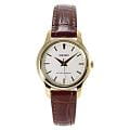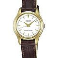 Женские кварцевые часы Seiko — это надёжный и универсальный аксессуар. Корпус размером 25,8 мм и толщиной 6 мм выполнен из нержавеющей стали с IP-покрытиемIP-покрытиеМетод ионного напыления. Демонстрирует повышенную устойчивость к истиранию, окислению и химическим веществам. Под воздействием высокого давления и температуры около 1500°C молекулы металла надёжно соединяются с частицами корпуса часов. цвета золота. Циферблат белого цвета оформлен индексами и стрелками, включая центральную секундную стрелку. Циферблат защищён прочным закалённым минеральным стеклом Hardlex минеральным стекломМинеральное стеклоМинеральное стекло представляет собой искусственно выращенный минерал кварца. Такое стекло отличается особой устойчивостью к повреждениям и царапинам. Уступает по некоторым качествам сапфировому стеклу.. Механизм — кварцевый с высокой точностью хода (±15 сек. в месяц). Часы оснащены коричневым кожаным ремешком на классической пряжке. Водонепроницаемость позволяет использовать часы в повседневных условиях. Идеальный выбор для тех, кто ценит японское качество и классический дизайн.