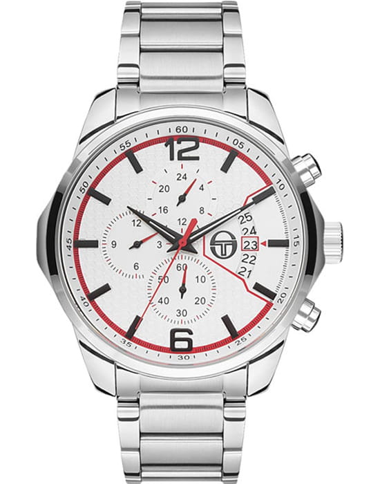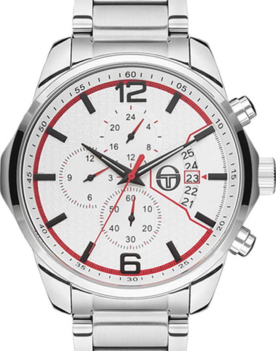 Sergio Tacchini ST.8.129.05 — мужские часы с выразительным спортивным стилем и функциональностью профессионального уровня. Корпус и браслет выполнены из нержавеющей стали, что обеспечивает прочность и благородный блеск. Белый циферблат с контрастными красными акцентами и чёрными метками придаёт модели динамичный характер, подчёркивая итальянский дух бренда. Встроенный хронографХронографФункция позволяет измерять отрезки времени с особой точностью: часы, минуты, секунды. Верным признаком хронографа является наличие на циферблате 3 дополнительных окошек-счётчиков. с тремя счётчиками позволяет измерять промежутки времени с высокой точностью, а апертура даты у отметки «3 часа» добавляет практичности. Поверхность циферблата защищена минеральным стекломМинеральное стеклоМинеральное стекло представляет собой искусственно выращенный минерал кварца. Такое стекло отличается особой устойчивостью к повреждениям и царапинам. Уступает по некоторым качествам сапфировому стеклу., устойчивым к царапинам, а надёжная раскладная застёжкаРаскладная застёжкаТакой тип застёжки используется только на браслетах из металла. Она никогда не раскрывается полностью, происходит разделение на 2 и более частей. Раскладывающая застёжка снизит вероятность потери часов к минимуму. обеспечивает комфорт и безопасность при ношении. Водозащита 50 м подходит для ежедневного использования. Sergio Tacchini — это спортивная элегантность и точность, воплощённые в классическом итальянском дизайне.