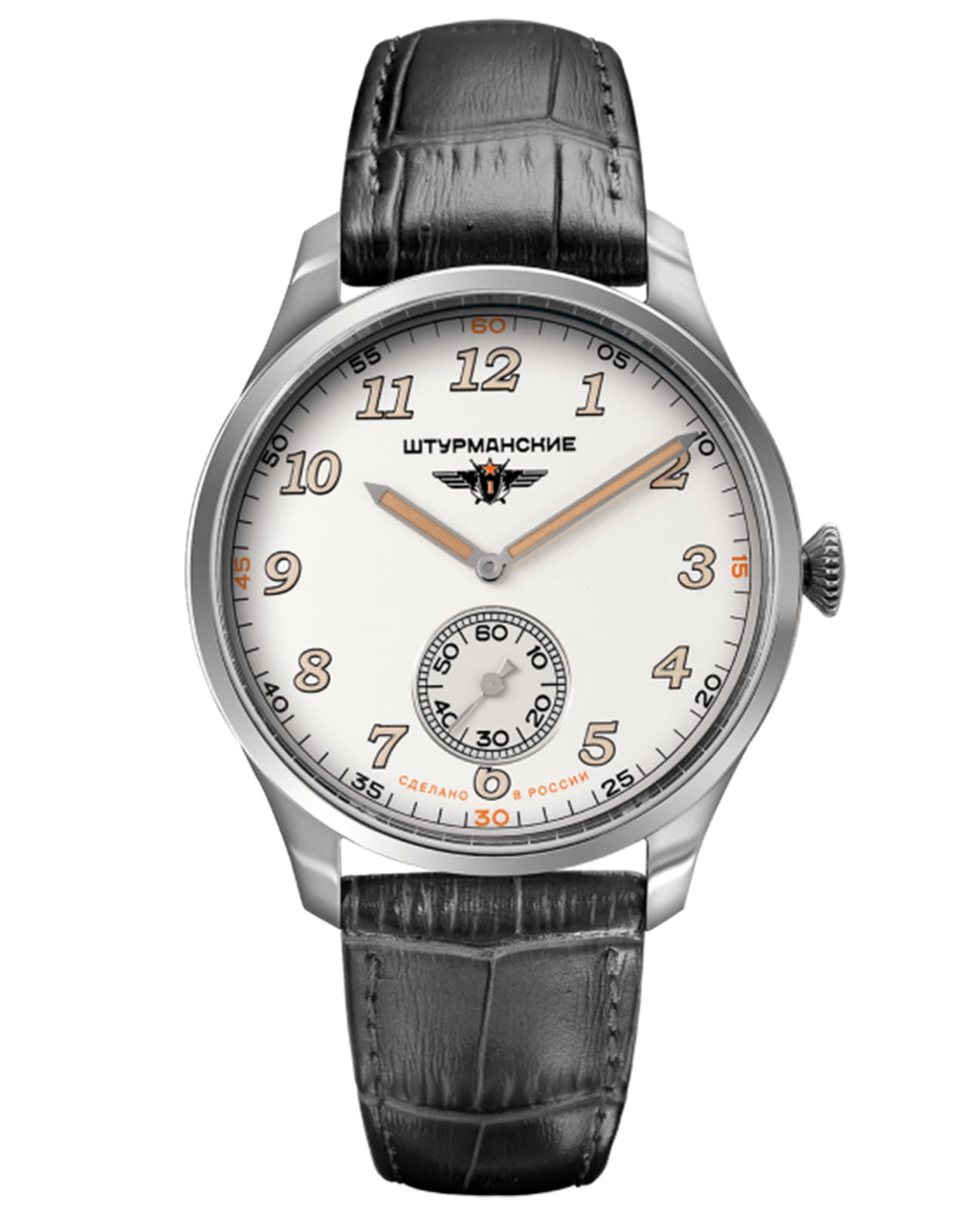 Штурманские мужские российские кварцевые часы с минеральным стекломМинеральное стеклоМинеральное стекло представляет собой искусственно выращенный минерал кварца. Такое стекло отличается особой устойчивостью к повреждениям и царапинам. Уступает по некоторым качествам сапфировому стеклу. кварцевый механизм с высокой точностью. Класс водозащиты: 50 метров, позволит защитить корпус от случайных брызг или капель дождя. Корпус часов изготовлен из стали. Кожаный ремешок на стандартной застёжке. Стрелки и метки с люминесцентным покрытиемЛюминесцентное покрытиеПозволяет считывать показания времени в темноте. Производители наносят на стрелки, часовые индексы, безель или поверхность циферблата светонакопительный состав, дающий холодное свечение..