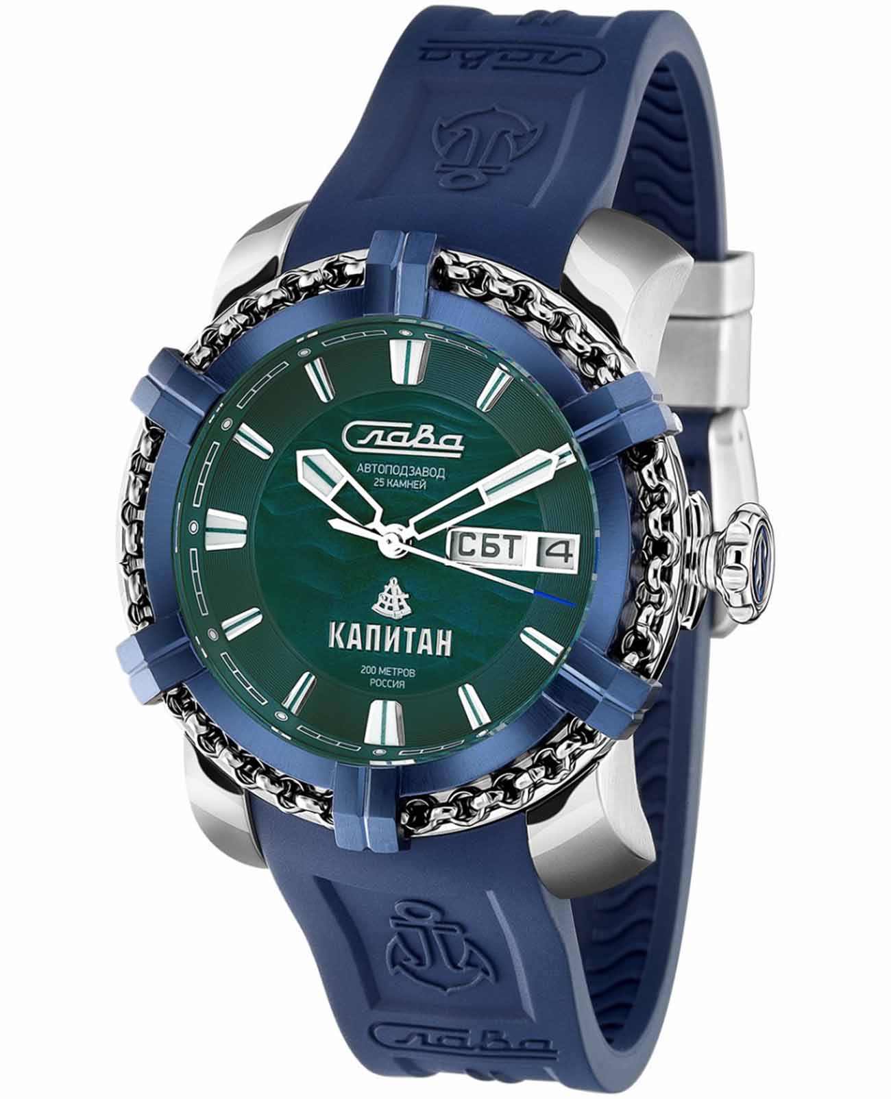 Российские механические наручные часы Слава Капитан 2470466/800-2427 — идеальный выбор для мужчин, ценящих стиль и надежность. Эта уникальная модель выпущена ограниченной серией в 500 экземпляров и сочетает в себе модный дизайн и высокое качество исполнения. Корпус часов выполнен из прочной стали и имеет диаметр 44 мм и толщину 16 мм, что придает им солидный и мужественный вид. БезельБезельВнешний ободок, закрепляющий стекло. В спортивных часах так называется поворотное кольцо с делениями на циферблате, выполняет роль таймера – замеряет отрезки времени на шкале. Неподвижный безель – элемент декора. Однонаправленно вращающийся безель на дайверских часах позволяет фиксировать моменты погружения и выныривания на поверхность. часов с IP-покрытиемIP-покрытиеМетод ионного напыления. Демонстрирует повышенную устойчивость к истиранию, окислению и химическим веществам. Под воздействием высокого давления и температуры около 1500°C молекулы металла надёжно соединяются с частицами корпуса часов. покрытием сине-серебристого цвета, выполненный в форме штурвала под стать названию коллекции "Капитан", придаёт часам неповторимый морской характер и стиль. Водозащита до 20 ATM позволяет использовать часы даже при погружении в воду, что делает их отличным выбором для активных мужчин. Зеленый циферблат с метками и сапфировое стеклоСапфировое стеклоПрочный и надёжный материал из кристалла сапфира синтетического происхождения, характеризующийся особой твёрдостью и устойчивостью к царапинам и повреждениям. обеспечивают долговечность и устойчивость к царапинам. Механический механизм "Слава 2427" с автоподзаводом и возможностью ручного подзавода гарантирует точность и надежность, а двойной календарь добавляет функциональности. На 3 часах расположено окошко с указателем даты и дня недели. Часы комплектуются прочным силиконовым ремешком со стандартной застежкой, обеспечивающим комфорт и надежную фиксацию на запястье. Задняя крышка крепится на 4-х винтах и украшена объемным изображением якоря. Индивидуальный серийный номер. Упакованы в стильную подарочную коробку из экокожи, они станут отличным подарком для любого особого случая. С часами Слава из коллекции Капитан вы подчеркнете свой статус и вкус, оставаясь верным российским традициям качества и стиля.