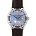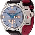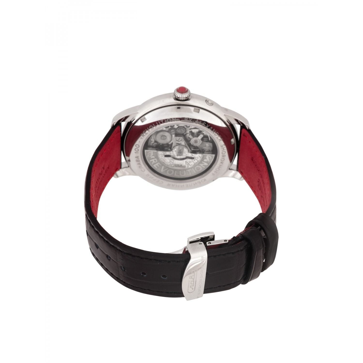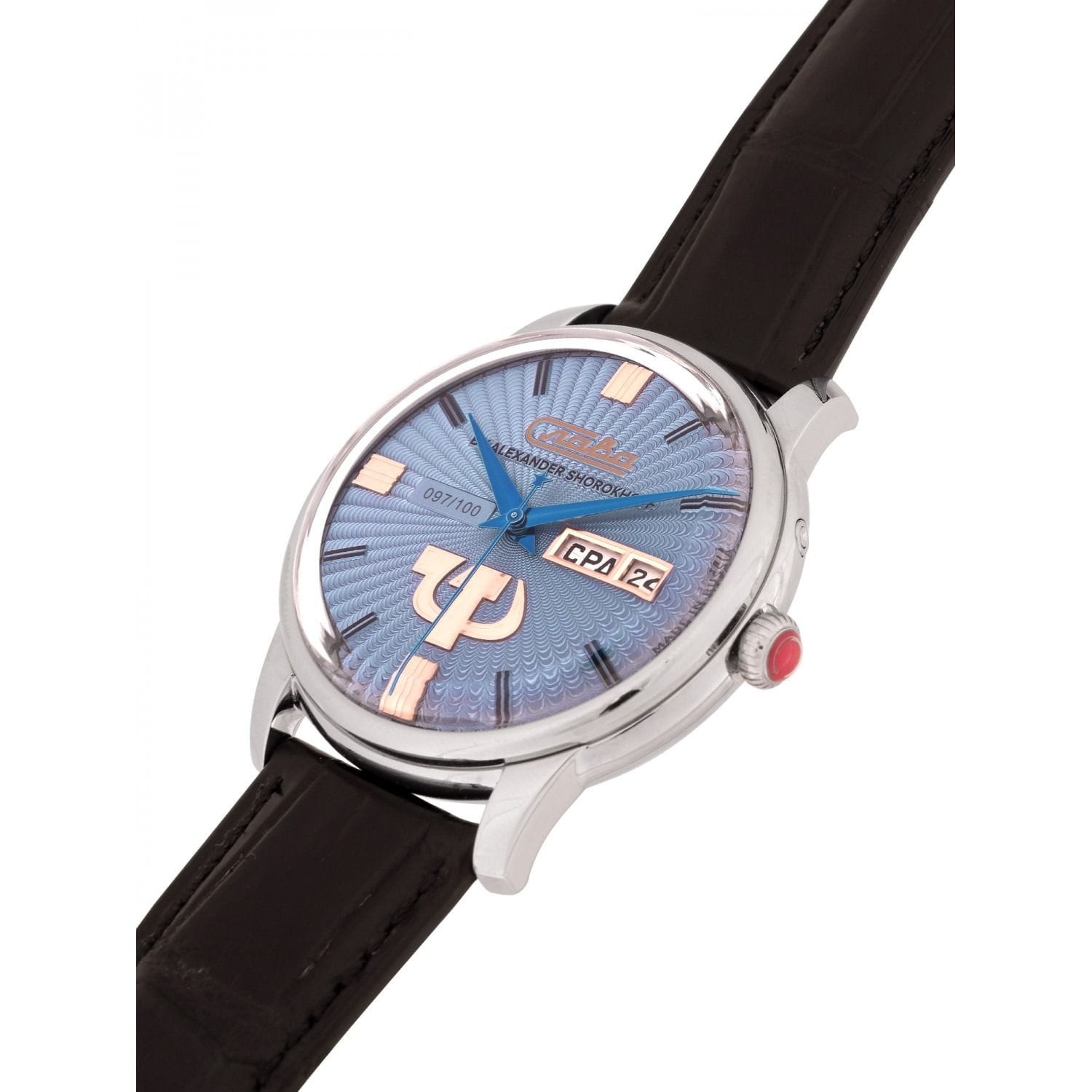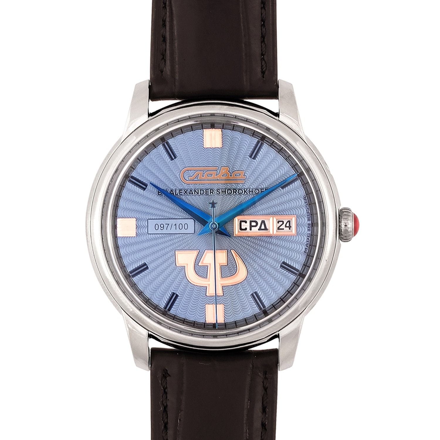 Российские механические часы с автоподзаводом Слава Традиция 2600271/300-2427 созданы для тех, кто ценит стиль и надежность. Эта модель является плодом сотрудничества Часовой компании «Слава» и знаменитого мастера Александра Шорохова, который известен своим вкладом в возрождение российского часового мастерства и продвижение культуры в мире. Эти часы выполнены в соответствии с эскизами мастера, с использованием революционных символов — серпа и молота. Часы Слава «Революция» обладают механизмом с автоподзаводом «Слава 2427», украшенным ручной гравировкой, который можно наблюдать через прозрачную заднюю крышку. Этот механизм обеспечивает надежность и точность, а также добавляет элемент эксклюзивности. Корпус часов выполнен из стали и имеет серебристый оттенок, который гармонично сочетается с голубым циферблатом. Диаметр корпуса составляет 44 мм, а толщина — 14,5 мм, что делает часы выразительными и комфортными для носки.  Сапфировое стеклоСапфировое стеклоПрочный и надёжный материал из кристалла сапфира синтетического происхождения, характеризующийся особой твёрдостью и устойчивостью к царапинам и повреждениям. защищает циферблат от царапин и обеспечивает долгий срок службы. Часы оснащены функцией двойного календаря, который отображает дату, что добавляет практичности в повседневной носке. Натуральный кожаный ремешок с застежкой «бабочка»Застёжка "бабочка"Такой вид застёжки дополняется предохранителями, помогающими избежать случайного раскрытия браслета. Обладают изящным исполнением. завершают образ, обеспечивая удобство и стиль. С водонепроницаемостью до 100 метров эти часы подходят для активного образа жизни, позволяя не беспокоиться о случайных контактах с водой, таких как плавание или дождь. Слава «Революция» выпускаются ограниченной серией — в трех видах по 100 штук.