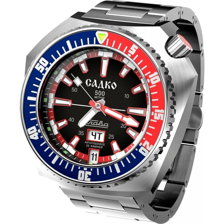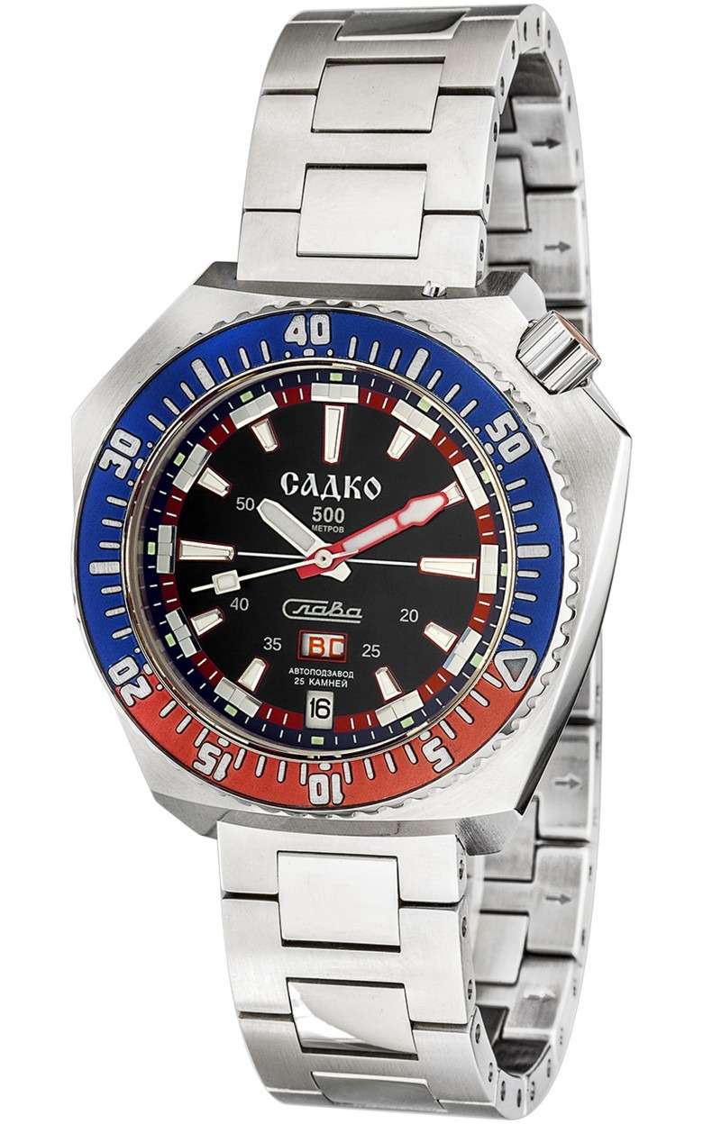 Стильные часы Слава Садко 5007167/100-2427 — станут надежным спутником как в повседневной жизни, так и при покорении морских глубин. Эти часы, созданные в России, оснащены механическим механизмом Слава 2427 с автоподзаводом, который обеспечивает точность и надежность. Корпус выполнен из высококачественной стали 316L. Поворотный безельБезельВнешний ободок, закрепляющий стекло. В спортивных часах так называется поворотное кольцо с делениями на циферблате, выполняет роль таймера – замеряет отрезки времени на шкале. Неподвижный безель – элемент декора. Однонаправленно вращающийся безель на дайверских часах позволяет фиксировать моменты погружения и выныривания на поверхность. часов с IP-покрытиемIP-покрытиеМетод ионного напыления. Демонстрирует повышенную устойчивость к истиранию, окислению и химическим веществам. Под воздействием высокого давления и температуры около 1500°C молекулы металла надёжно соединяются с частицами корпуса часов. красного и синего цвета придаёт модели особую элегантность и долговечность. Черный циферблат с метками в виде штрихов надежно защищён сапфировым стекломСапфировое стеклоПрочный и надёжный материал из кристалла сапфира синтетического происхождения, характеризующийся особой твёрдостью и устойчивостью к царапинам и повреждениям., толщина которого составляет 3 мм. Заводная головка с защитой, расположенная в положении 2 часа, и литой стальной браслет с застежкой «бабочка»Застёжка "бабочка"Такой вид застёжки дополняется предохранителями, помогающими избежать случайного раскрытия браслета. Обладают изящным исполнением. обеспечивают комфорт и удобство в использовании. Эти часы имеют водозащиту 500WR, позволяя погружаться на глубину до 50 атмосфер, что делает их идеальными для дайвинга. Автоматический гелиевый клапан добавляет дополнительную надежность при подводных приключениях. Функциональность часов дополнена календарём с отображением числа и дня недели, который удобно расположен в позиции 6 часов. Кнопка быстрого перевода календаря делает настройку простой и лёгкой. Стрелки и метки обладают люминесцентным покрытиемЛюминесцентное покрытиеПозволяет считывать показания времени в темноте. Производители наносят на стрелки, часовые индексы, безель или поверхность циферблата светонакопительный состав, дающий холодное свечение., которое светится в темноте после зарядки на свету, обеспечивая отличную видимость в любых условиях. Каждый экземпляр из лимитированной серии в 500 штук уникален и имеет номер на задней крышке, украшенной объёмным изображением, выполненным методом чеканки. Механизм часов поддерживает 25 камней и работает с частотой 18000 полуколебаний в час, предлагая запас хода до 40 часов и возможность ручного завода. Противоударное устройство оси баланса добавляет уверенности в их долговечности. Эти часы — идеальный выбор для тех, кто ценит стиль, надежность и функциональность в одном аксессуаре.