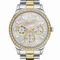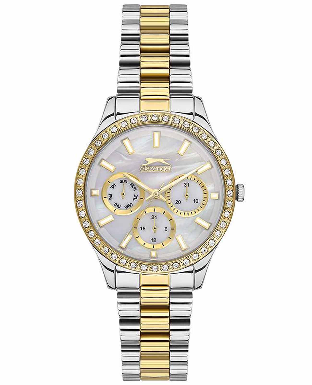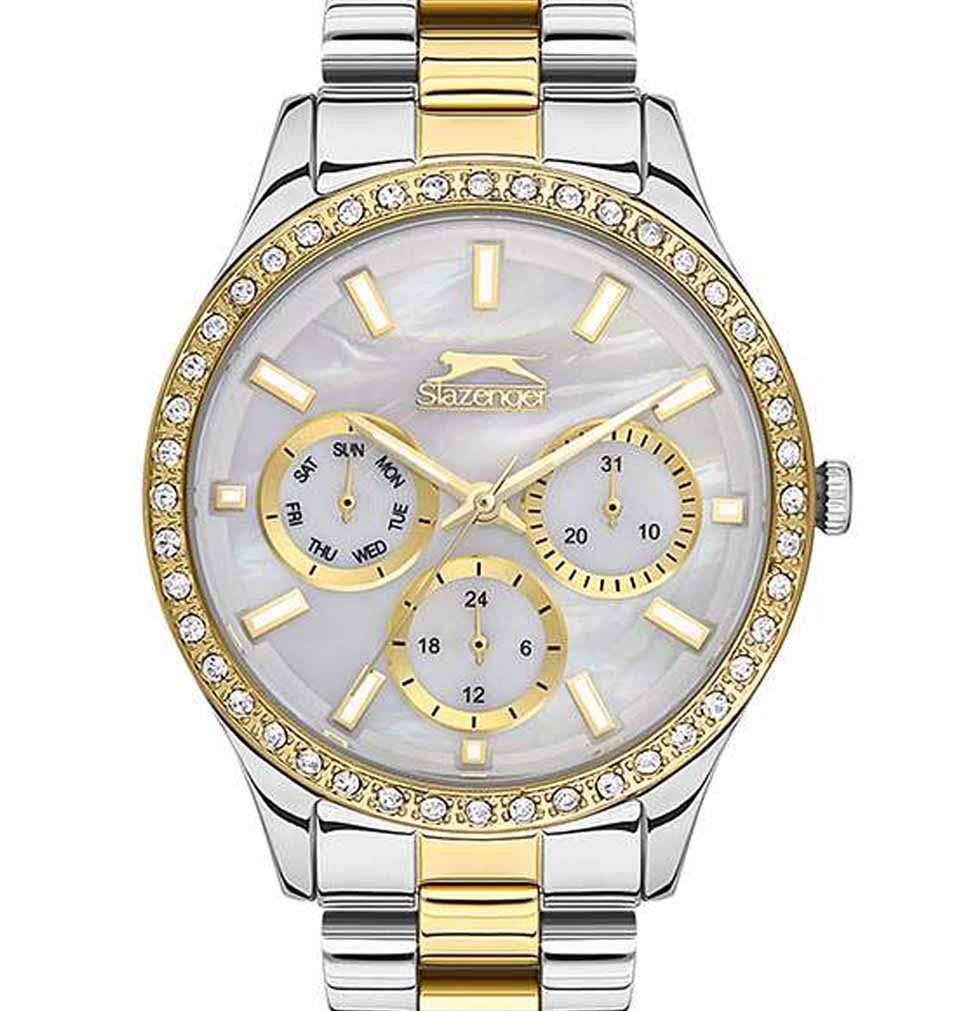 Женские наручные часы Slazenger SLSL.09.2069.4.03 сочетают в себе классический дизайн и высокое качество исполнения. Модель обладает круглым корпусом диаметром 34 мм, изготовленным из суперметалла, что обеспечивает устойчивость к внешним воздействиям. Браслет выполнен из суперметалла с частичным IP-покрытиемIP-покрытиеМетод ионного напыления. Демонстрирует повышенную устойчивость к истиранию, окислению и химическим веществам. Под воздействием высокого давления и температуры около 1500°C молекулы металла надёжно соединяются с частицами корпуса часов. на раскладной застёжкеРаскладная застёжкаТакой тип застёжки используется только на браслетах из металла. Она никогда не раскрывается полностью, происходит разделение на 2 и более частей. Раскладывающая застёжка снизит вероятность потери часов к минимуму.. Неподвижный безельБезельВнешний ободок, закрепляющий стекло. В спортивных часах так называется поворотное кольцо с делениями на циферблате, выполняет роль таймера – замеряет отрезки времени на шкале. Неподвижный безель – элемент декора. Однонаправленно вращающийся безель на дайверских часах позволяет фиксировать моменты погружения и выныривания на поверхность. из суперметалла с IP-покрытиемIP-покрытиеМетод ионного напыления. Демонстрирует повышенную устойчивость к истиранию, окислению и химическим веществам. Под воздействием высокого давления и температуры около 1500°C молекулы металла надёжно соединяются с частицами корпуса часов. украшен кристаллами. Перламутровый циферблат оформлен логотипом бренда и метками времени. Имеются дополнительные малые циферблаты для отображения даты, дня недели и текущего времени в 24-часовом формате. Для защиты используется минеральное стеклоМинеральное стеклоМинеральное стекло представляет собой искусственно выращенный минерал кварца. Такое стекло отличается особой устойчивостью к повреждениям и царапинам. Уступает по некоторым качествам сапфировому стеклу., обеспечивающее прочную защиту от царапин. Стрелки и метки имеют люминесцентное покрытиеЛюминесцентное покрытиеПозволяет считывать показания времени в темноте. Производители наносят на стрелки, часовые индексы, безель или поверхность циферблата светонакопительный состав, дающий холодное свечение., что позволяет легко читать время в темноте. Часы работают на японском кварцевом механизме, который обеспечивает точность хода без необходимости подзаводки. Водонепроницаемость часов составляет 3 атмосферы (WR30), что позволяет защитить корпус от случайных брызг или капель дождя.