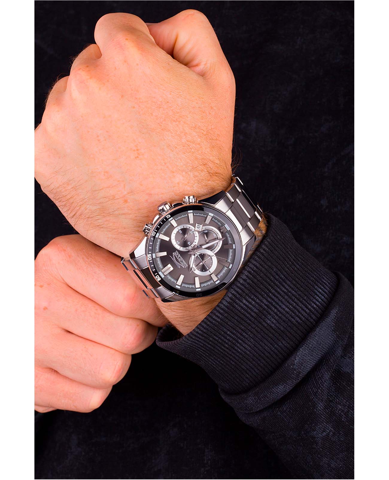 Мужские наручные часы-хронографХронографФункция позволяет измерять отрезки времени с особой точностью: часы, минуты, секунды. Верным признаком хронографа является наличие на циферблате 3 дополнительных окошек-счётчиков. Slazenger SL.09.2078.2.01 сочетают в себе классический дизайн и надежность современных технологий. Модель обладает круглым корпусом диаметром 48 мм, изготовленным из стали с серебристым покрытием, что обеспечивает высокую устойчивость к внешним воздействиям. Браслет выполнен из суперметалла с раскладной застежкойРаскладная застёжкаТакой тип застёжки используется только на браслетах из металла. Она никогда не раскрывается полностью, происходит разделение на 2 и более частей. Раскладывающая застёжка снизит вероятность потери часов к минимуму., гарантирующей комфортное ношение и безопасность. БезельБезельВнешний ободок, закрепляющий стекло. В спортивных часах так называется поворотное кольцо с делениями на циферблате, выполняет роль таймера – замеряет отрезки времени на шкале. Неподвижный безель – элемент декора. Однонаправленно вращающийся безель на дайверских часах позволяет фиксировать моменты погружения и выныривания на поверхность. с IP-покрытиемIP-покрытиеМетод ионного напыления. Демонстрирует повышенную устойчивость к истиранию, окислению и химическим веществам. Под воздействием высокого давления и температуры около 1500°C молекулы металла надёжно соединяются с частицами корпуса часов.. Циферблат серого цвета декорирован стрелками с функцией хронографа, позволяя измерять короткие промежутки времени, а также имеет окошко даты для повседневного использования. Для защиты используется минеральное стеклоМинеральное стеклоМинеральное стекло представляет собой искусственно выращенный минерал кварца. Такое стекло отличается особой устойчивостью к повреждениям и царапинам. Уступает по некоторым качествам сапфировому стеклу., обеспечивающее прочную защиту от царапин. Часы работают на кварцевом механизме, что гарантирует точное время без необходимости подзаводки. Водонепроницаемость часов достигает 50 метров (5 атмосфер), что позволяет использовать их во время плавания, однако не рекомендуется для дайвинга или других водных видов спорта. Вес модели составляет 158 грамм, а производитель предоставляет гарантию сроком 12 месяцев. SL.09.2078.2.01 — это стильный аксессуар, который станет отличным дополнением как формального, так и casual образа мужчины.