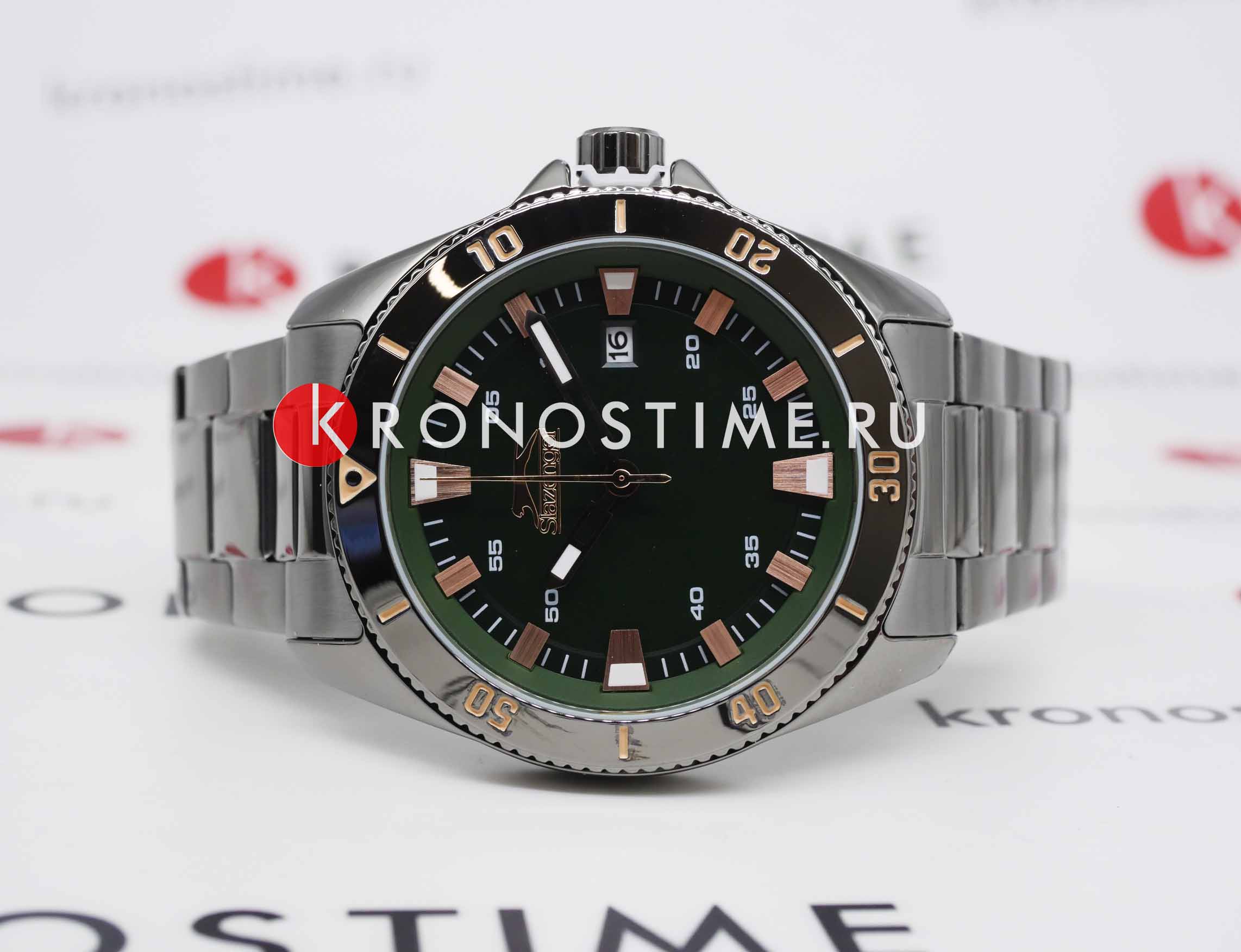 Мужские наручные часы Slazenger SL.09.2114.2.02 сочетают в себе классический дизайн и надежность современных технологий. Модель обладает круглым корпусом диаметром 44 мм. Корпус и браслет изготовлены из суперметалла с IP-покрытиемIP-покрытиеМетод ионного напыления. Демонстрирует повышенную устойчивость к истиранию, окислению и химическим веществам. Под воздействием высокого давления и температуры около 1500°C молекулы металла надёжно соединяются с частицами корпуса часов., что обеспечивает высокую устойчивость к внешним воздействиям. Браслет выполнен с раскладной застежкойРаскладной замокДанный вариант застежки используется только на часах с металлическим браслетом. Отличительная особенность такого крепления в том, что длина браслета становится универсальной и вы можете самостоятельно отрегулировать нужный вам размер – застежка просто двигается по браслету часов., гарантирующей комфортное ношение и безопасность. Циферблат декорирован стрелками с люминесцентным покрытиемЛюминесцентное покрытиеПозволяет считывать показания времени в темноте. Производители наносят на стрелки, часовые индексы, безель или поверхность циферблата светонакопительный состав, дающий холодное свечение., которые обеспечивают читаемость времени даже в условиях недостаточной освещенности. Для защиты используется минеральное стеклоМинеральное стеклоМинеральное стекло представляет собой искусственно выращенный минерал кварца. Такое стекло отличается особой устойчивостью к повреждениям и царапинам. Уступает по некоторым качествам сапфировому стеклу., обеспечивающее прочную защиту от царапин. Поворотный безельБезельВнешний ободок, закрепляющий стекло. В спортивных часах так называется поворотное кольцо с делениями на циферблате, выполняет роль таймера – замеряет отрезки времени на шкале. Неподвижный безель – элемент декора. Однонаправленно вращающийся безель на дайверских часах позволяет фиксировать моменты погружения и выныривания на поверхность.. Часы работают на кварцевом механизме, что гарантирует точное время без необходимости подзаводки. Модель также оснащена функцией отображения даты, делая ее практичной для повседневного использования. Водонепроницаемость часов достигает 5 атмосфер (WR50), что позволяет использовать их во время плавания, однако они не предназначены для дайвинга или других водных видов спорта.