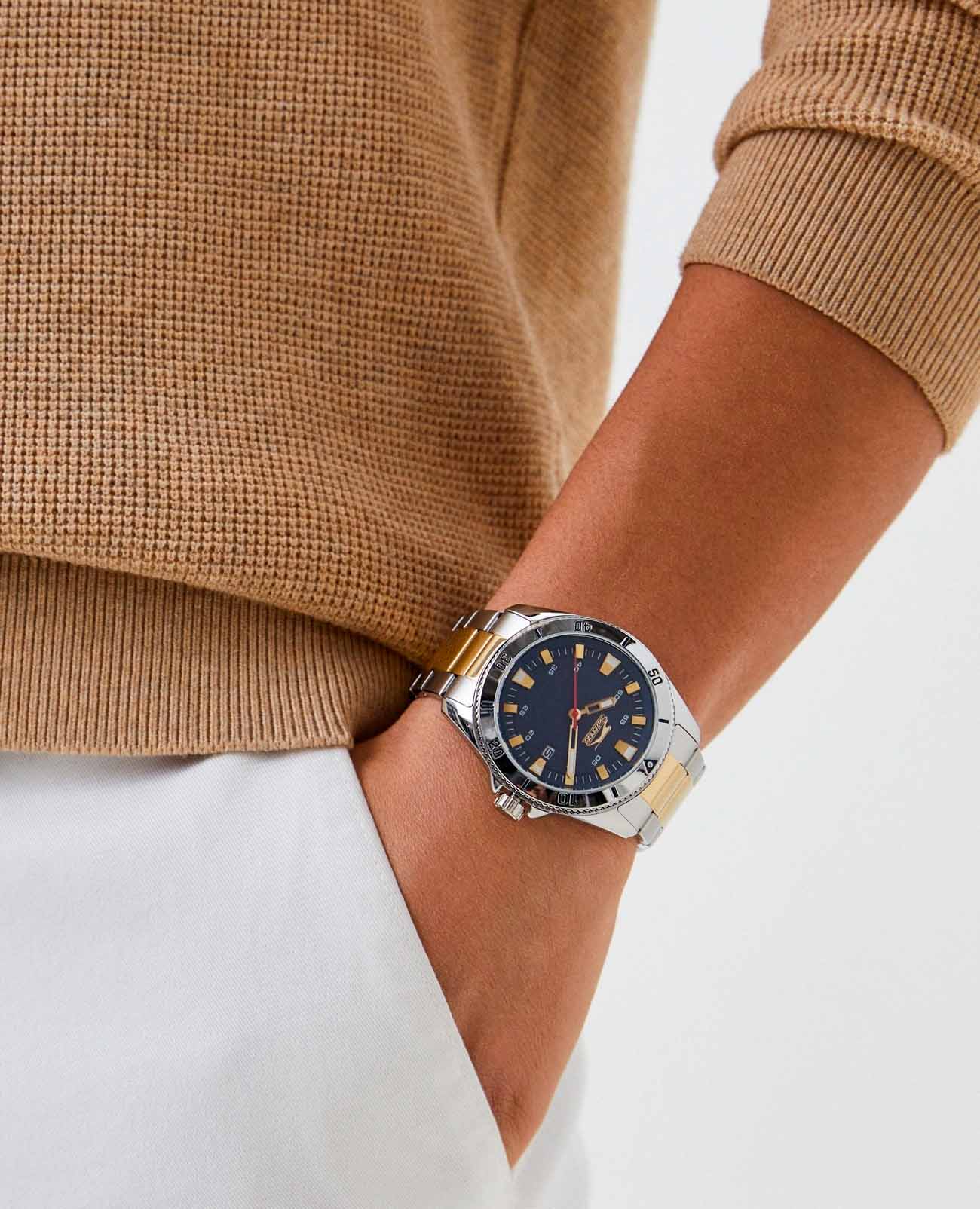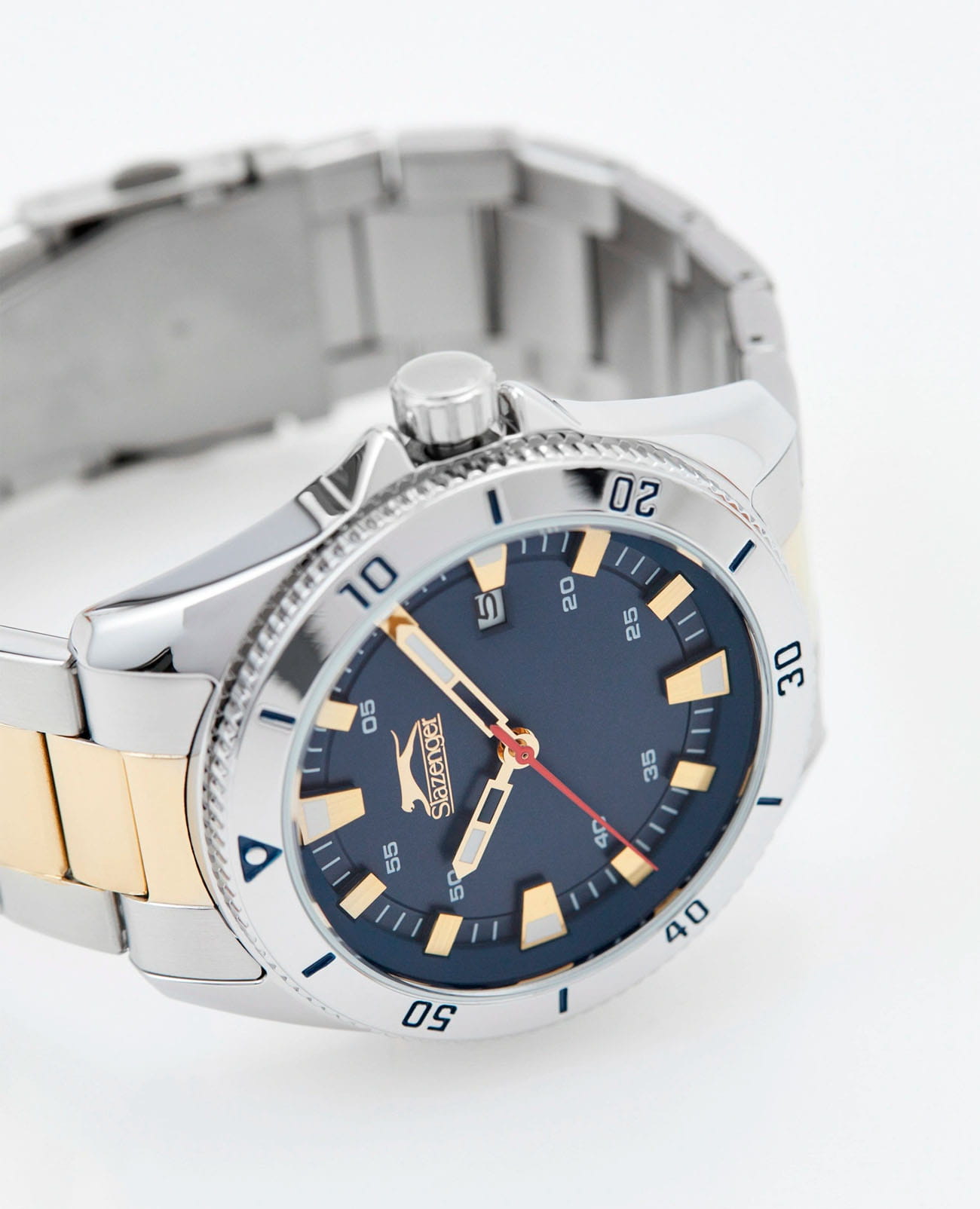 Мужские наручные часы Slazenger SL.09.2114.2.03 сочетают в себе классический дизайн и надежность современных технологий. Модель обладает круглым корпусом диаметром 44 мм, изготовленным из суперметалла, что обеспечивает высокую устойчивость к внешним воздействиям. Браслет выполнен из того же материала с частичным IP-покрытиемIP-покрытиеМетод ионного напыления. Демонстрирует повышенную устойчивость к истиранию, окислению и химическим веществам. Под воздействием высокого давления и температуры около 1500°C молекулы металла надёжно соединяются с частицами корпуса часов. раскладной застежкойРаскладная застёжкаТакой тип застёжки используется только на браслетах из металла. Она никогда не раскрывается полностью, происходит разделение на 2 и более частей. Раскладывающая застёжка снизит вероятность потери часов к минимуму., гарантирующей комфортное ношение и безопасность. Синий циферблат украшен индексами и оснащен окном даты. Для защиты применяется минеральное стеклоМинеральное стеклоМинеральное стекло представляет собой искусственно выращенный минерал кварца. Такое стекло отличается особой устойчивостью к повреждениям и царапинам. Уступает по некоторым качествам сапфировому стеклу., устойчивое к царапинам. Часы работают на кварцевом механизме, что гарантирует точное время без необходимости подзаводки. Водонепроницаемость часов достигает 5 атмосфер (50 метров), что позволяет использовать их при контакте с водой, например, во время мытья рук или попадания брызг, однако не рекомендуется для плавания.