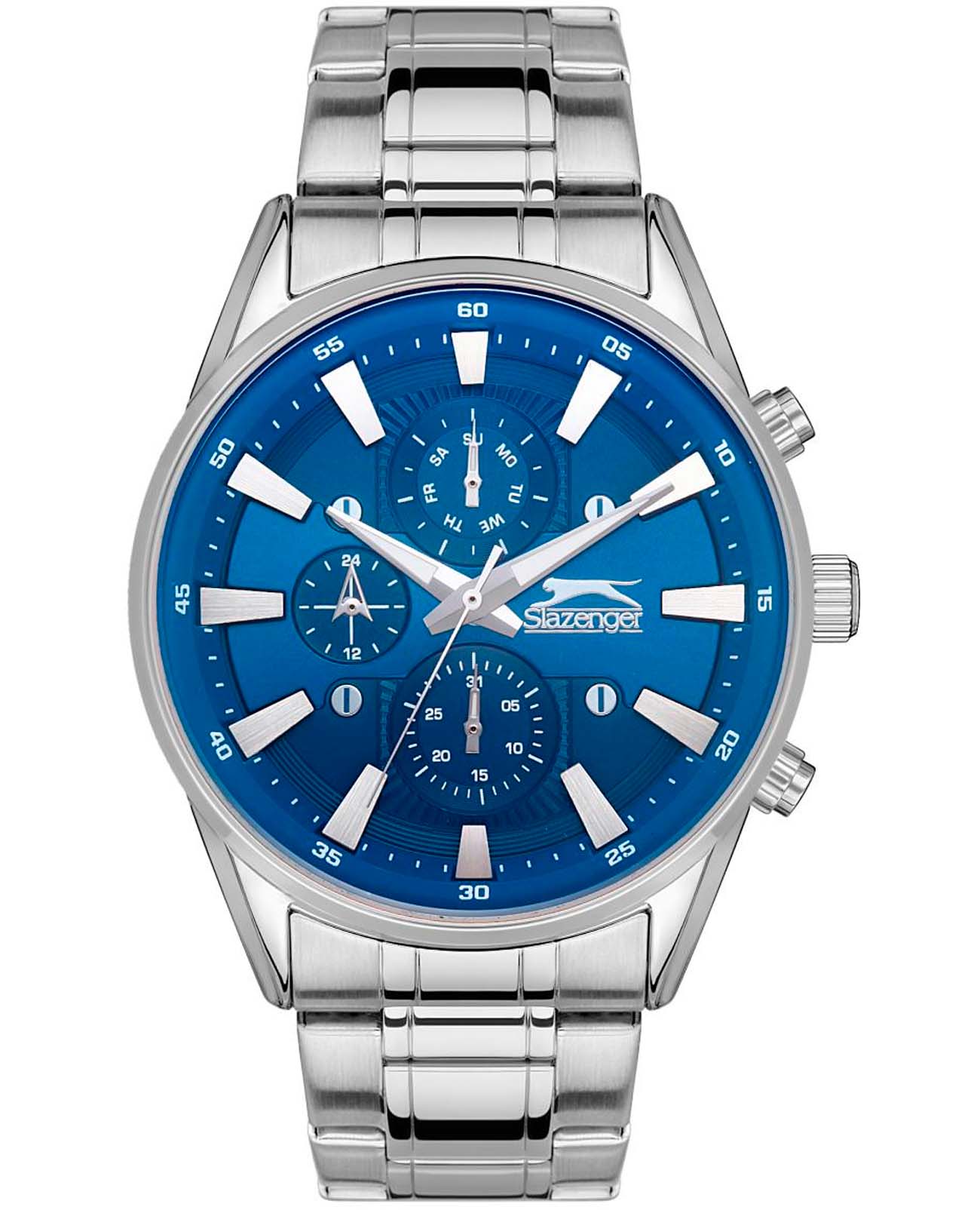 Мужские наручные часы Slazenger SL.09.2118.2.01 сочетают в себе классический дизайн и надежность современных технологий. Модель обладает круглым корпусом диаметром 46 мм, изготовленным из суперметалла, что обеспечивает высокую устойчивость к внешним воздействиям. Браслет выполнен из стали с раскладной застежкойРаскладной замокДанный вариант застежки используется только на часах с металлическим браслетом. Отличительная особенность такого крепления в том, что длина браслета становится универсальной и вы можете самостоятельно отрегулировать нужный вам размер – застежка просто двигается по браслету часов., гарантирующей комфортное ношение и безопасность. Циферблат темно-синего цвета декорирован стрелками, которые обеспечивают читаемость времени даже в условиях недостаточной освещенности. Для защиты используется минеральное стеклоМинеральное стеклоМинеральное стекло представляет собой искусственно выращенный минерал кварца. Такое стекло отличается особой устойчивостью к повреждениям и царапинам. Уступает по некоторым качествам сапфировому стеклу., обеспечивающее прочную защиту от царапин. Часы работают на японском кварцевом механизме, что гарантирует точное время без необходимости подзаводки. Модель также оснащена дополнительными отображениями на малых циферблатах даты, дня недели и текущего времени в 24-часовом формате, делая ее практичной для повседневного использования. Водонепроницаемость часов достигает 5 атмосфер (WR50), что позволяет использовать их во время плавания, однако не рекомендуется для дайвинга или других водных видов спорта. Вес модели составляет 155 грамм .