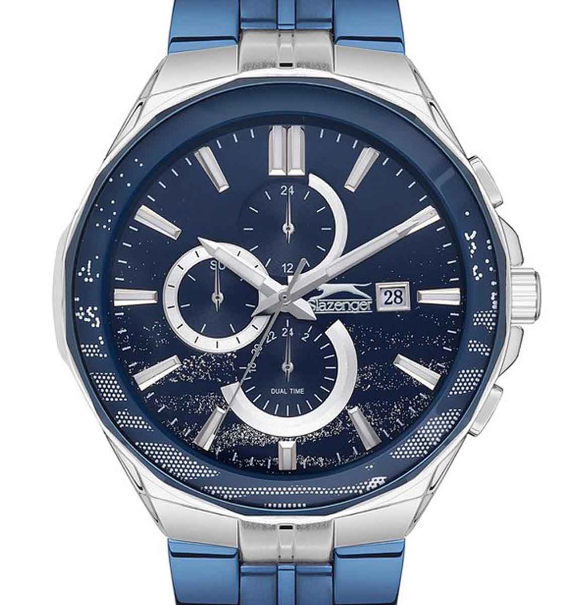 Часы Slazenger SL.09.2129.2.05 воплощают в себе элегантность и практичность, идеально подходящие для современных мужчин. Их синий циферблат, защищенный минеральным стекломМинеральное стеклоМинеральное стекло представляет собой искусственно выращенный минерал кварца. Такое стекло отличается особой устойчивостью к повреждениям и царапинам. Уступает по некоторым качествам сапфировому стеклу., заключен в серебристый корпус диаметром 47 мм, который изготовлен из прочного суперметалла. Часы оснащены двойным форматом времени (12 и 24 часа), вторым часовым поясом и удобным окошком даты. Надежный кварцевый механизм обеспечивает точность, а водозащита 5 ATM делает их устойчивыми к воздействию воды. Стальной браслет из суперметалла с IP-покрытиемIP-покрытиеМетод ионного напыления. Демонстрирует повышенную устойчивость к истиранию, окислению и химическим веществам. Под воздействием высокого давления и температуры около 1500°C молекулы металла надёжно соединяются с частицами корпуса часов. синего цвета имеет раскладную застёжкуРаскладная застёжкаТакой тип застёжки используется только на браслетах из металла. Она никогда не раскрывается полностью, происходит разделение на 2 и более частей. Раскладывающая застёжка снизит вероятность потери часов к минимуму., что подчеркивает современный стиль и позволяет легко снимать часы. Часы оснащены 24-часовым указателем времени, а также функциями отображения даты и дня недели. Люминесцентное покрытиеЛюминесцентное покрытиеПозволяет считывать показания времени в темноте. Производители наносят на стрелки, часовые индексы, безель или поверхность циферблата светонакопительный состав, дающий холодное свечение. на стрелках и метках обеспечивает отличную видимость в темноте.