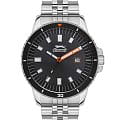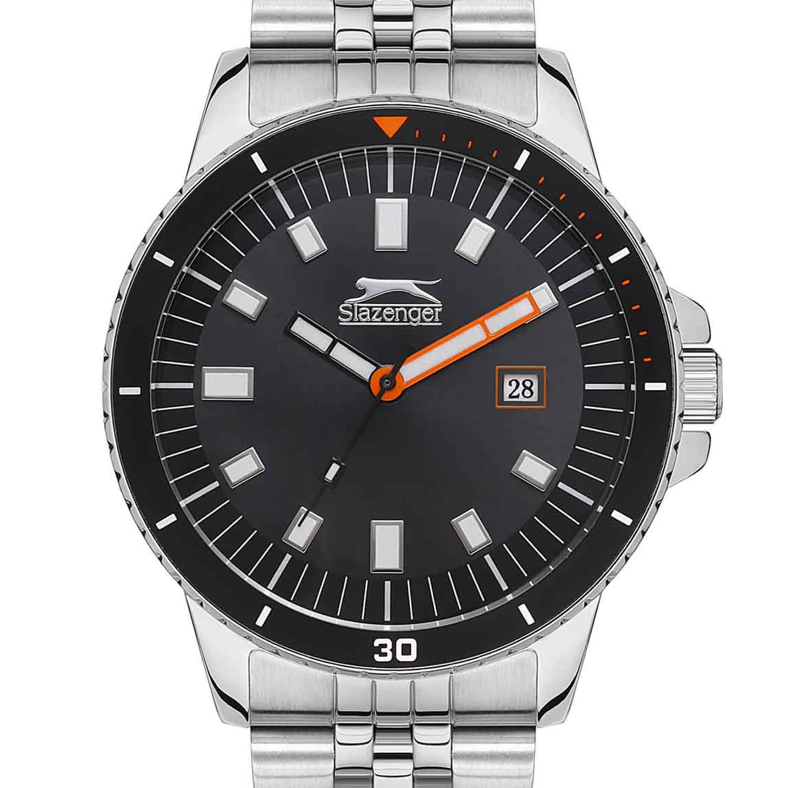 Часы Slazenger SL.09.2135.1.03 воплощают в себе элегантность и практичность, идеально подходящие для современных мужчин. Их черный циферблат, защищенный минеральным стекломМинеральное стеклоМинеральное стекло представляет собой искусственно выращенный минерал кварца. Такое стекло отличается особой устойчивостью к повреждениям и царапинам. Уступает по некоторым качествам сапфировому стеклу., заключен в серебристый корпус диаметром 45 мм, который изготовлен из прочного суперметалла. Неподвижный безельБезельВнешний ободок, закрепляющий стекло. В спортивных часах так называется поворотное кольцо с делениями на циферблате, выполняет роль таймера – замеряет отрезки времени на шкале. Неподвижный безель – элемент декора. Однонаправленно вращающийся безель на дайверских часах позволяет фиксировать моменты погружения и выныривания на поверхность. с IP-покрытиемIP-покрытиеМетод ионного напыления. Демонстрирует повышенную устойчивость к истиранию, окислению и химическим веществам. Под воздействием высокого давления и температуры около 1500°C молекулы металла надёжно соединяются с частицами корпуса часов. черного цвета. Часы оснащены удобным окошком даты и стрелками контрастного цвета. Надежный кварцевый механизм обеспечивает точность, а водозащита 5 ATM делает их устойчивыми к воздействию воды. Стальной браслет из суперметалла имеет раскладную застёжкуРаскладная застёжкаТакой тип застёжки используется только на браслетах из металла. Она никогда не раскрывается полностью, происходит разделение на 2 и более частей. Раскладывающая застёжка снизит вероятность потери часов к минимуму., что подчеркивает современный стиль и позволяет легко снимать часы. Люминесцентное покрытиеЛюминесцентное покрытиеПозволяет считывать показания времени в темноте. Производители наносят на стрелки, часовые индексы, безель или поверхность циферблата светонакопительный состав, дающий холодное свечение. на стрелках и метках обеспечивает отличную видимость в темноте.