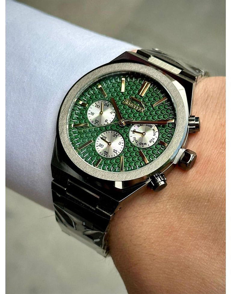 Часы Slazenger SL.09.2137.2.05 воплощают в себе элегантность и практичность, идеально подходящие для современных мужчин. Их зелёный циферблат с оригинальным рисунком в виде сот, защищен минеральным стекломМинеральное стеклоМинеральное стекло представляет собой искусственно выращенный минерал кварца. Такое стекло отличается особой устойчивостью к повреждениям и царапинам. Уступает по некоторым качествам сапфировому стеклу. и заключен в черный матовый корпус диаметром 44 мм из прочного суперметалла с IP-покрытиемIP-покрытиеМетод ионного напыления. Демонстрирует повышенную устойчивость к истиранию, окислению и химическим веществам. Под воздействием высокого давления и температуры около 1500°C молекулы металла надёжно соединяются с частицами корпуса часов.. Часы оснащены двойным форматом времени (12 и 24 часа), указателями дней недели и даты на дополнительных малых циферблатах. Надежный кварцевый механизм обеспечивает точность, а водозащита 5 ATM делает их устойчивыми к воздействию воды. Черный браслет из суперметалла с IP-покрытиемIP-покрытиеМетод ионного напыления. Демонстрирует повышенную устойчивость к истиранию, окислению и химическим веществам. Под воздействием высокого давления и температуры около 1500°C молекулы металла надёжно соединяются с частицами корпуса часов. имеет раскладную застёжкуРаскладная застёжкаТакой тип застёжки используется только на браслетах из металла. Она никогда не раскрывается полностью, происходит разделение на 2 и более частей. Раскладывающая застёжка снизит вероятность потери часов к минимуму., что подчеркивает современный стиль и позволяет легко снимать часы. Размер браслета (H1-H2): 24-20 мм.