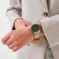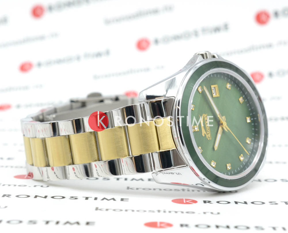 Женские наручные часы Slazenger SL.09.2142.3.03 сочетают в себе элегантный дизайн и надежность современных технологий. Модель обладает корпусом размерами 37 мм, изготовленным из суперметалла, что обеспечивает высокую устойчивость к внешним воздействиям. БезельБезельВнешний ободок, закрепляющий стекло. В спортивных часах так называется поворотное кольцо с делениями на циферблате, выполняет роль таймера – замеряет отрезки времени на шкале. Неподвижный безель – элемент декора. Однонаправленно вращающийся безель на дайверских часах позволяет фиксировать моменты погружения и выныривания на поверхность. с IP-покрытиемIP-покрытиеМетод ионного напыления. Демонстрирует повышенную устойчивость к истиранию, окислению и химическим веществам. Под воздействием высокого давления и температуры около 1500°C молекулы металла надёжно соединяются с частицами корпуса часов.. Браслет из суперметалла с частичным IP-покрытиемIP-покрытиеМетод ионного напыления. Демонстрирует повышенную устойчивость к истиранию, окислению и химическим веществам. Под воздействием высокого давления и температуры около 1500°C молекулы металла надёжно соединяются с частицами корпуса часов. гарантирует комфортное ношение и стильный внешний вид. Циферблат зеленого цвета декорирован кристаллами в виде меток. Для защиты используется минеральное стеклоМинеральное стеклоМинеральное стекло представляет собой искусственно выращенный минерал кварца. Такое стекло отличается особой устойчивостью к повреждениям и царапинам. Уступает по некоторым качествам сапфировому стеклу., обеспечивающее прочную защиту от царапин. Часы работают на кварцевом механизме, поэтому гарантирует точное время без необходимости подзаводки. Модель также оснащена функцией отображения даты, делая ее практичной для повседневного использования. Водонепроницаемость часов достигает 3 атмосфер, что позволяет использовать их при мытье рук или хождении под мелким дождем, однако не рекомендуется для плавания или других водных видов спорта. Вес модели составляет 97 грамм.