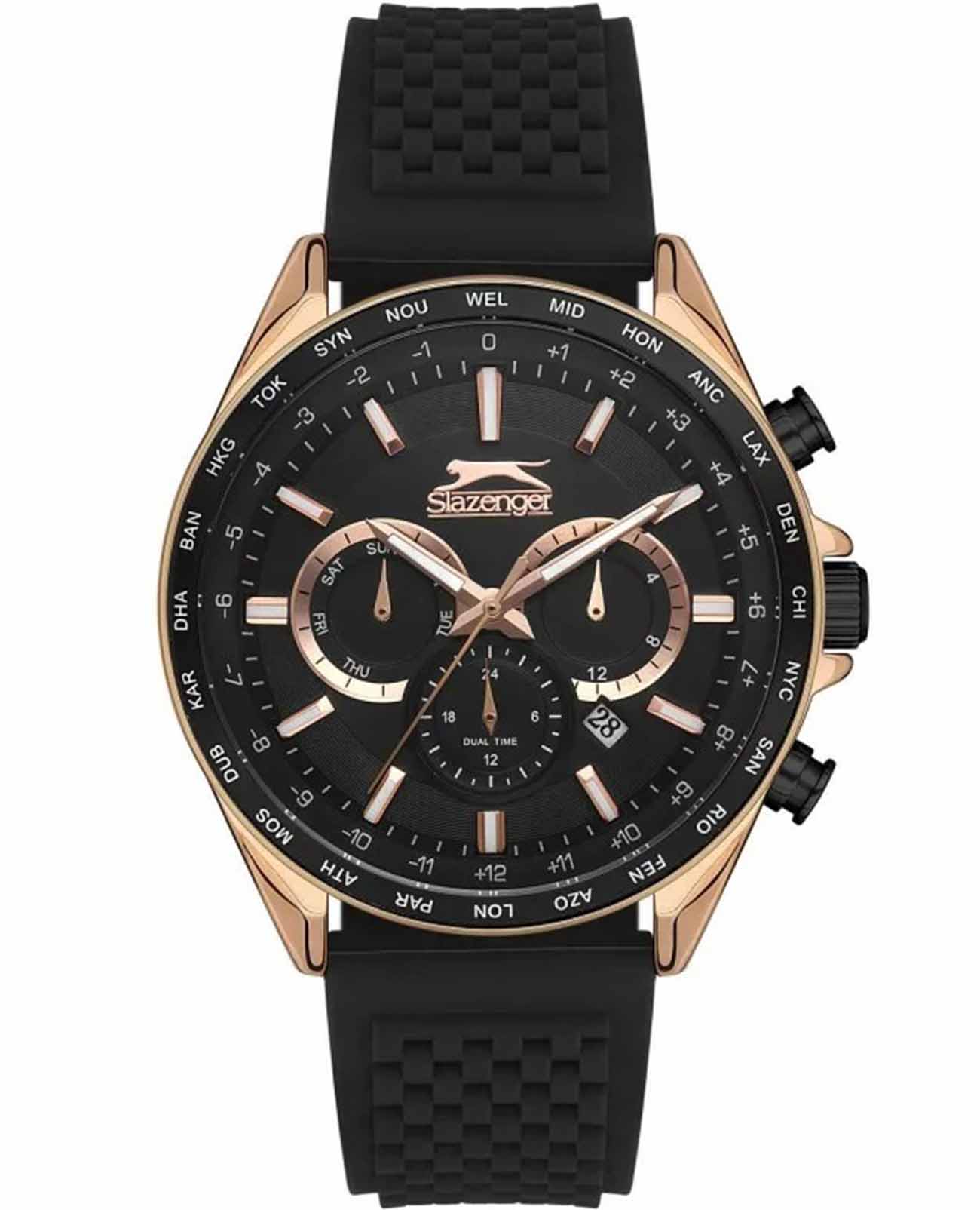 Мужские наручные часы Slazenger SL.09.2179.2.02 — стильный аксессуар с ярко выраженными спортивными чертами, который станет надежным спутником в повседневной жизни. Эти часы оснащены кварцевым механизмом, обеспечивающим высокую точность хода. Металлический корпус с золотистым IP-покрытиемIP-покрытиеМетод ионного напыления. Демонстрирует повышенную устойчивость к истиранию, окислению и химическим веществам. Под воздействием высокого давления и температуры около 1500°C молекулы металла надёжно соединяются с частицами корпуса часов. в сочетании с черным силиконовый ремешком на классической застежке шириной 22 мм создает гармоничный и современный образ. Диаметр корпуса составляет 45 мм, а толщина — 11 мм, что придает часам стильный и выразительный вид. БезельБезельВнешний ободок, закрепляющий стекло. В спортивных часах так называется поворотное кольцо с делениями на циферблате, выполняет роль таймера – замеряет отрезки времени на шкале. Неподвижный безель – элемент декора. Однонаправленно вращающийся безель на дайверских часах позволяет фиксировать моменты погружения и выныривания на поверхность. с черным IP-покрытиемIP-покрытиеМетод ионного напыления. Демонстрирует повышенную устойчивость к истиранию, окислению и химическим веществам. Под воздействием высокого давления и температуры около 1500°C молекулы металла надёжно соединяются с частицами корпуса часов., что придает ему дополнительную прочность и устойчивость к износу. Минеральное стеклоМинеральное стеклоМинеральное стекло представляет собой искусственно выращенный минерал кварца. Такое стекло отличается особой устойчивостью к повреждениям и царапинам. Уступает по некоторым качествам сапфировому стеклу. защищает циферблат от царапин и внешних воздействий, а водозащита уровня WR 50 позволяет не беспокоиться о случайных контактах с водой, будь то дождь или мытье рук. Особенностью данной модели является наличие календаря, отображающего дату и день недели, а также возможность следить за временем во втором часовом поясе. Люминесцентное покрытиеЛюминесцентное покрытиеПозволяет считывать показания времени в темноте. Производители наносят на стрелки, часовые индексы, безель или поверхность циферблата светонакопительный состав, дающий холодное свечение. на стрелках и метках обеспечивает отличную видимость в темноте.
