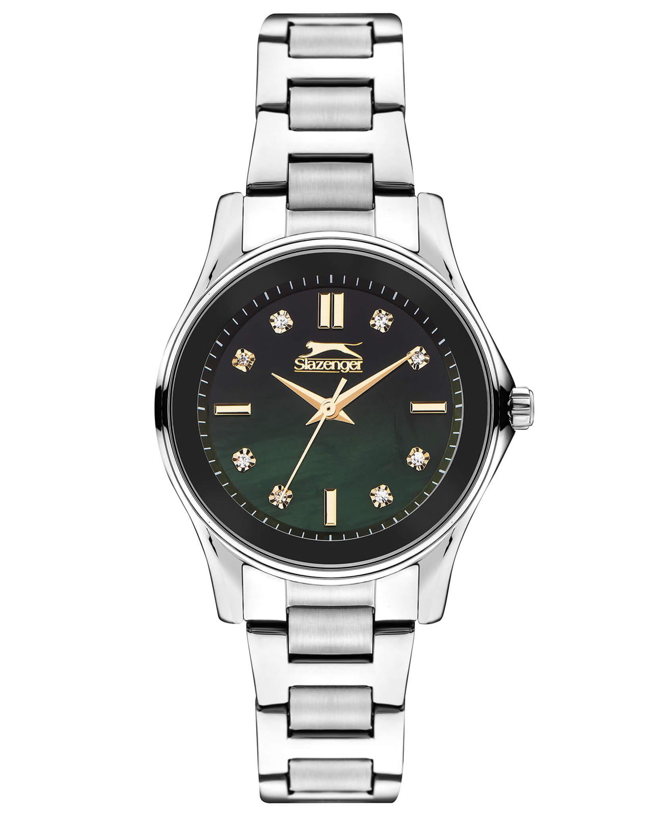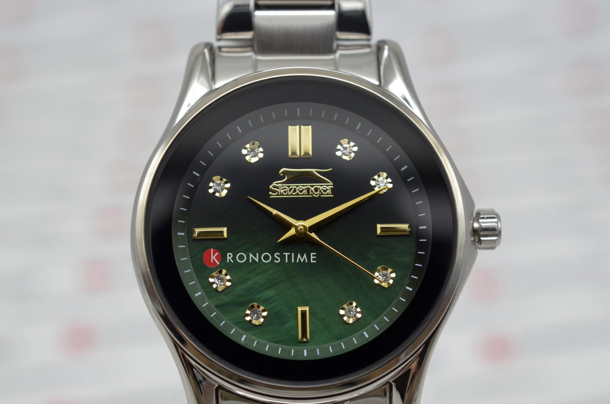 Женские наручные часы Slazenger SL.09.2235.3.05 сочетают в себе классический дизайн и надежность современных технологий. Модель обладает круглым корпусом диаметром 32 мм, изготовленным из суперметалла, что обеспечивает высокую устойчивость к внешним воздействиям. Индексы украшены фианитами. Браслет выполнен из суперметалла с раскладной застежкойРаскладной замокДанный вариант застежки используется только на часах с металлическим браслетом. Отличительная особенность такого крепления в том, что длина браслета становится универсальной и вы можете самостоятельно отрегулировать нужный вам размер – застежка просто двигается по браслету часов., гарантирующей комфортное ношение и безопасность. Циферблат перламутрового цвета декорирован золотистыми стрелками и индексами, которые обеспечивают читаемость времени даже в условиях недостаточной освещенности. Для защиты используется минеральное стеклоМинеральное стеклоМинеральное стекло представляет собой искусственно выращенный минерал кварца. Такое стекло отличается особой устойчивостью к повреждениям и царапинам. Уступает по некоторым качествам сапфировому стеклу., обеспечивающее прочную защиту от царапин. Часы работают на кварцевом механизме, что гарантирует точное время без необходимости подзаводки. Водонепроницаемость часов достигает 3 атмосфер, что позволяет использовать их при мытье рук или хождении под мелким дождем, однако не рекомендуется для плавания или других водных видов спорта. Вес модели составляет 72 грамма.
