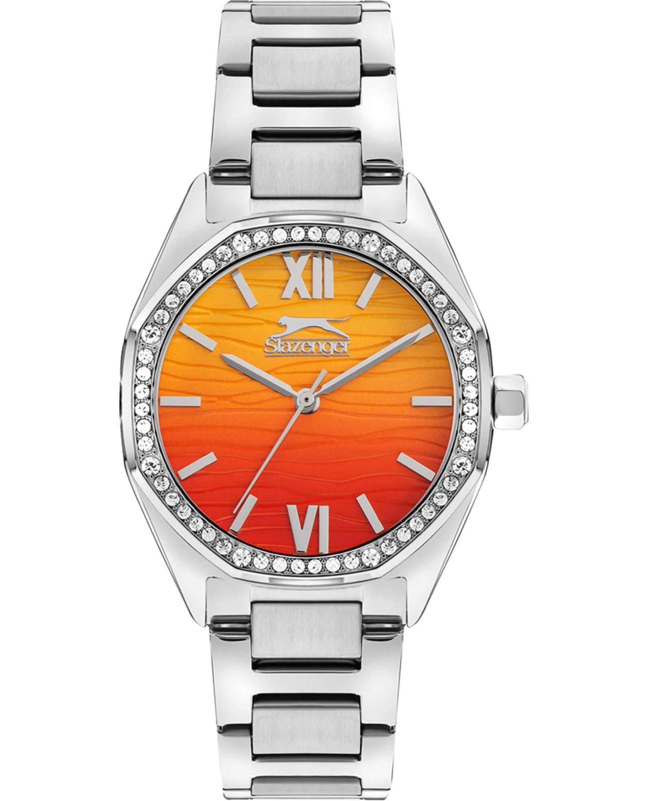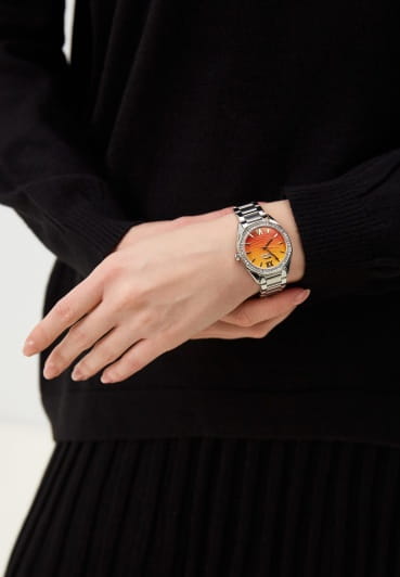 Женские кварцевые часы Slazenger SL.09.2301.3.07 — это элегантный и изысканный аксессуар, подчеркивающий стиль и утончённость. Корпус и браслет выполнены из суперметалла, защищён минеральным стекломМинеральное стеклоМинеральное стекло представляет собой искусственно выращенный минерал кварца. Такое стекло отличается особой устойчивостью к повреждениям и царапинам. Уступает по некоторым качествам сапфировому стеклу.. Циферблат с рельефным рисунком оформлен штриховыми метками и римскими цифрами VI и XII, дополнен логотипом бренда. Безель гранёный, украшен паве из фианитов, придающих модели изысканное сияние. Заводная головка — граненая, добавляющая детали дизайна. Браслет из суперметалла фиксируется на раскладной застёжкеРаскладная застёжкаТакой тип застёжки используется только на браслетах из металла. Она никогда не раскрывается полностью, происходит разделение на 2 и более частей. Раскладывающая застёжка снизит вероятность потери часов к минимуму., обеспечивая надёжность и комфорт ношения. Водонепроницаемость 30 м позволяет использовать часы в повседневных условиях, защищая от случайных брызг и капель дождя. Модель идеально подходит как для повседневного, так и для торжественного образа.