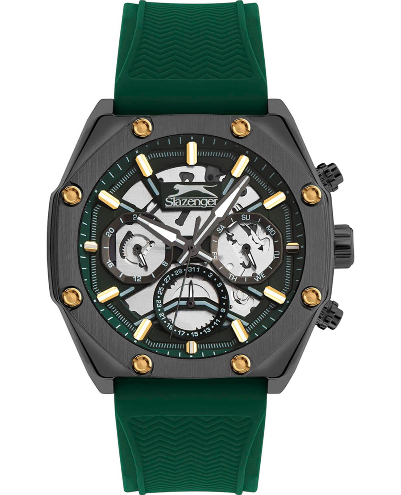 Мужские кварцевые часы Slazenger SL.09.2319.2.03 - это выразительный и функциональный аксессуар, сочетающий стиль, технологичность и насыщенную комплектацию. Корпус выполнен из суперметалла с IP-покрытиемIP-покрытиеМетод ионного напыления. Демонстрирует повышенную устойчивость к истиранию, окислению и химическим веществам. Под воздействием высокого давления и температуры около 1500°C молекулы металла надёжно соединяются с частицами корпуса часов., защищён минеральным стекломМинеральное стеклоМинеральное стекло представляет собой искусственно выращенный минерал кварца. Такое стекло отличается особой устойчивостью к повреждениям и царапинам. Уступает по некоторым качествам сапфировому стеклу.. Циферблат частично скелетонизирован и выполнен в зелёных тонах, что позволяет наблюдать за работой механизма. Часы оснащены вынесенными малыми циферблатами для индикации дня недели, даты и времени в 24-часовом формате. Стрелки и метки оснащены люминесцентным покрытиемЛюминесцентное покрытиеПозволяет считывать показания времени в темноте. Производители наносят на стрелки, часовые индексы, безель или поверхность циферблата светонакопительный состав, дающий холодное свечение., обеспечивающим хорошую читаемость в темноте. Удобный силиконовый ремешок зелёного цвета фиксируется на классической пряжке. Водонепроницаемость 50 м позволяет использовать часы в повседневных условиях, защищая от случайных брызг и капель дождя. Модель подчёркивает индивидуальность владельца и идеально подходит как для повседневного, так и для спортивного образа.