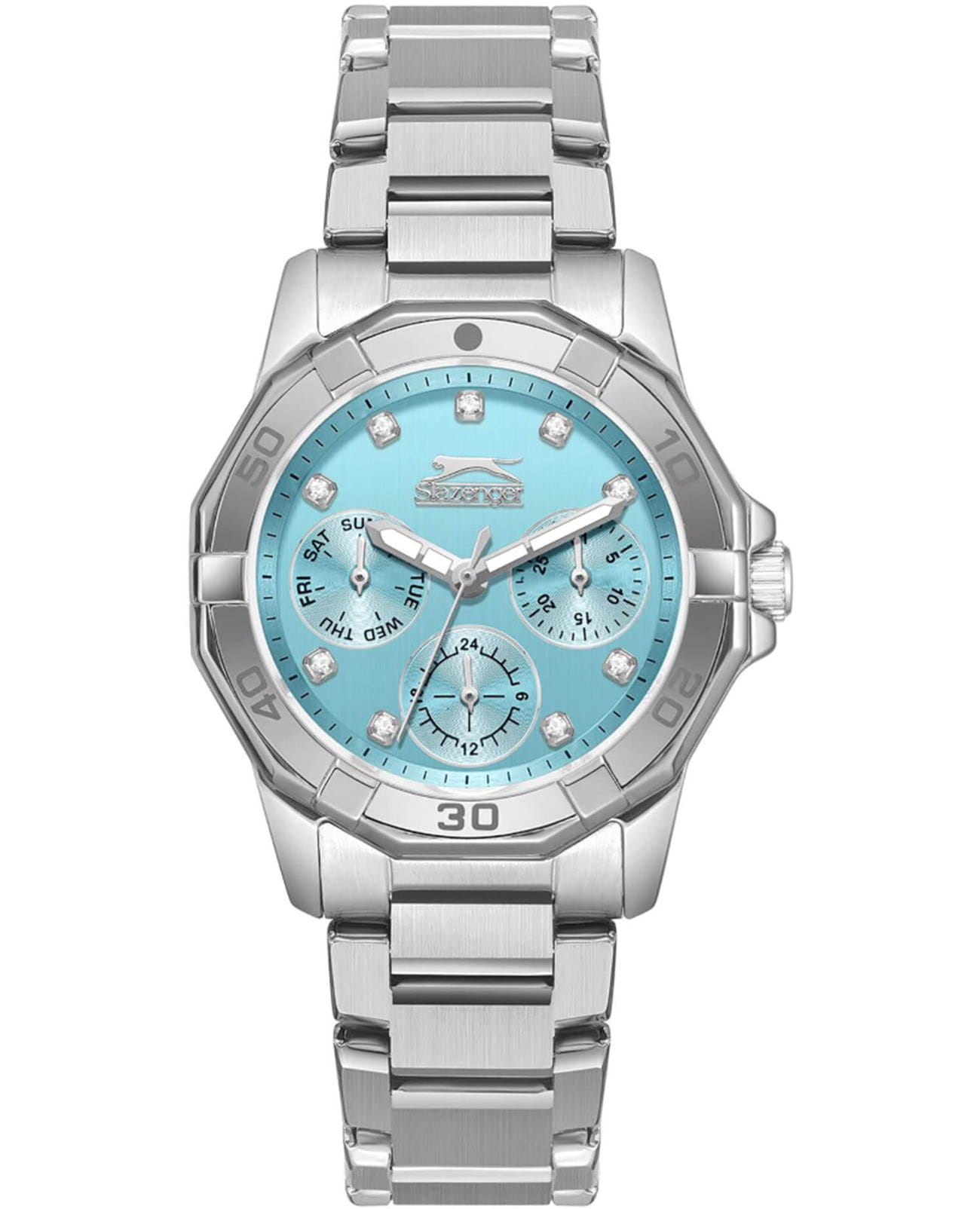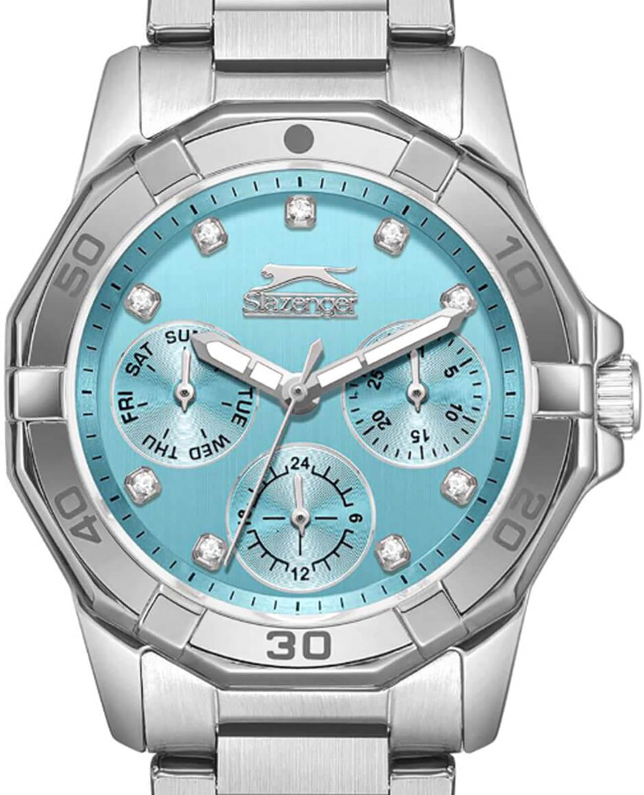 Женские кварцевые часы Slazenger — это элегантный и функциональный аксессуар. Корпус диаметром 33,5 мм и толщиной 10,5 мм выполнен из суперметалла. Циферблат голубого цвета оформлен индексами и стрелками, украшен фианитами. Циферблат защищён минеральным стекломМинеральное стеклоМинеральное стекло представляет собой искусственно выращенный минерал кварца. Такое стекло отличается особой устойчивостью к повреждениям и царапинам. Уступает по некоторым качествам сапфировому стеклу.. Механизм — кварцевый. Часы оснащены индикацией дня недели, даты и 12/24-часового формата времени. Часы оснащены браслетом из суперметалла с раскладной застёжкойРаскладная застёжкаТакой тип застёжки используется только на браслетах из металла. Она никогда не раскрывается полностью, происходит разделение на 2 и более частей. Раскладывающая застёжка снизит вероятность потери часов к минимуму.. Водонепроницаемость 50 м позволяет использовать часы в повседневных условиях. Гарантия — 12 месяцев. Идеальный выбор для тех, кто ценит стиль, функциональность и качество.