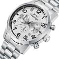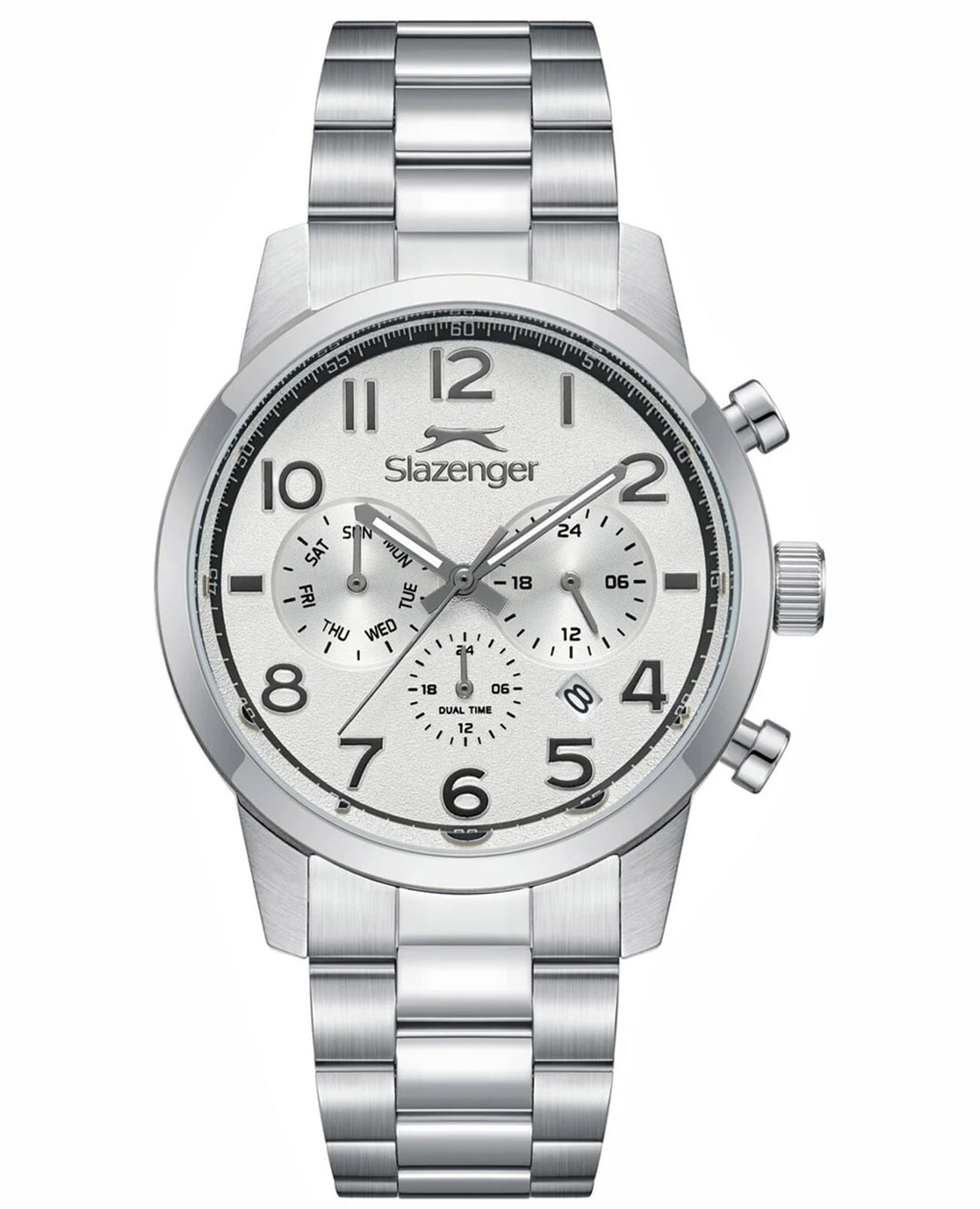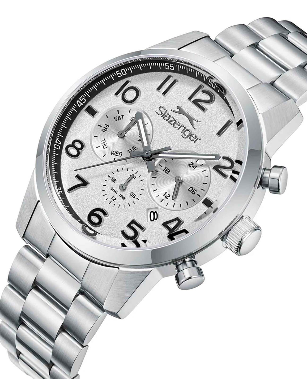 Мужские кварцевые часы Slazenger — это выразительный и функциональный аксессуар. Корпус диаметром 42 мм и толщиной 12 мм выполнен из нержавеющей стали 316L. Циферблат белого цвета оформлен индексами и стрелками. Окошко даты расположено на отметке в 6 часов. Указатель дня недели и 24-часовой формат времени вынесены на отдельные субциферблаты. Циферблат защищён минеральным стекломМинеральное стеклоМинеральное стекло представляет собой искусственно выращенный минерал кварца. Такое стекло отличается особой устойчивостью к повреждениям и царапинам. Уступает по некоторым качествам сапфировому стеклу.. Механизм — кварцевый калибр JP25. Часы оснащены функцией второго часового пояса (GMT)Второй часовой поясФункция, позволяющая отображать время двух часовых поясов одновременно.. Стрелки и метки с люминесцентным покрытиемЛюминесцентное покрытиеПозволяет считывать показания времени в темноте. Производители наносят на стрелки, часовые индексы, безель или поверхность циферблата светонакопительный состав, дающий холодное свечение., обеспечивающим хорошую читаемость в темноте. Часы оснащены стальным браслетом с раскладной застёжкойРаскладная застёжкаТакой тип застёжки используется только на браслетах из металла. Она никогда не раскрывается полностью, происходит разделение на 2 и более частей. Раскладывающая застёжка снизит вероятность потери часов к минимуму.. Водонепроницаемость 100 м позволяет использовать часы для плавания и повседневного ношения. Идеальный выбор для тех, кто ценит стиль, функциональность и качество.