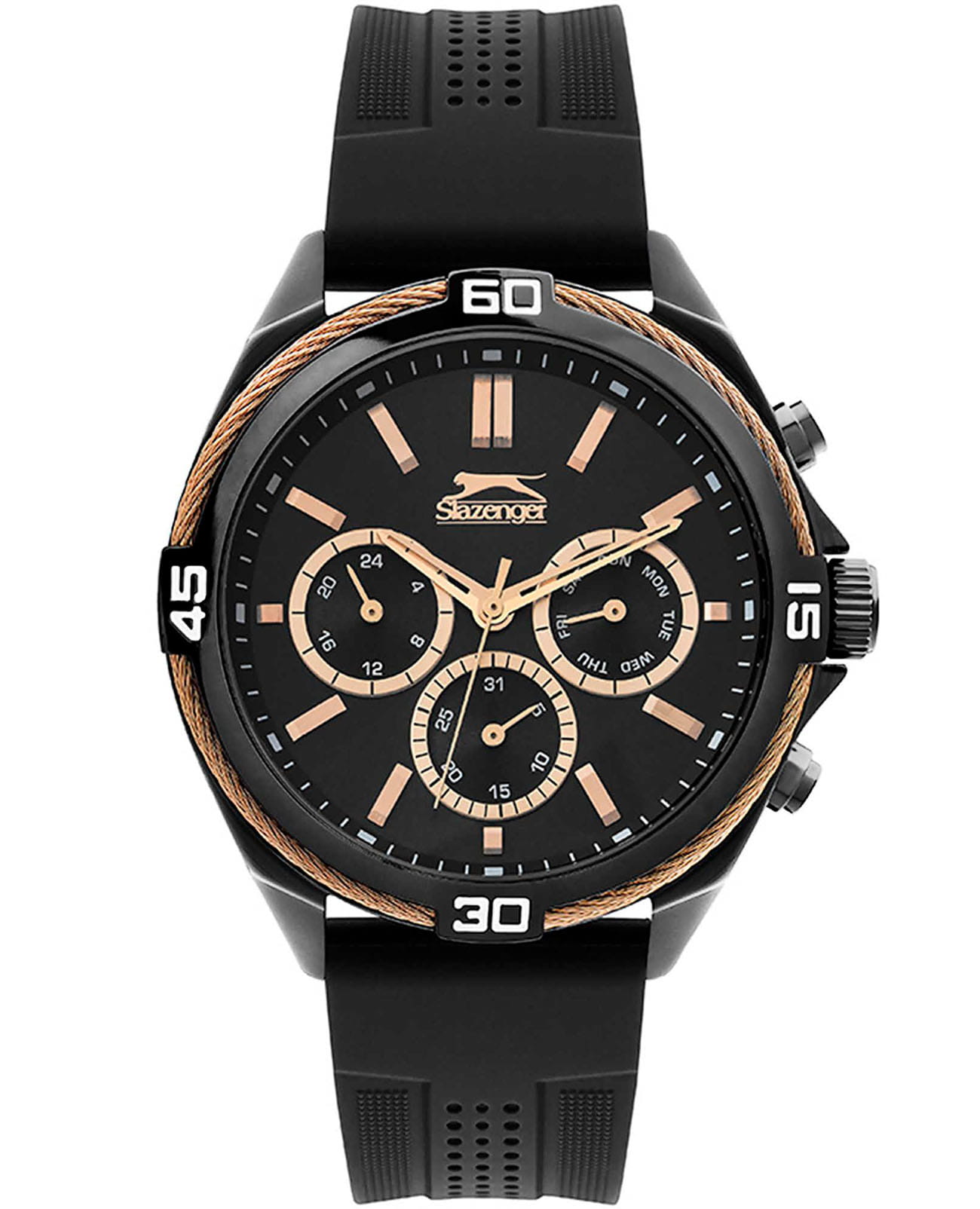 Мужские кварцевые часы Slazenger — это выразительный и функциональный аксессуар. Корпус диаметром 46 мм и толщиной 12 мм выполнен из суперметалла с IP-покрытиемIP-покрытиеМетод ионного напыления. Демонстрирует повышенную устойчивость к истиранию, окислению и химическим веществам. Под воздействием высокого давления и температуры около 1500°C молекулы металла надёжно соединяются с частицами корпуса часов.. Циферблат чёрного цвета оформлен индексами, стрелками и тремя вынесенными субциферблатами: для отображения дня недели, даты и 24-часового формата времени. Циферблат защищён минеральным стекломМинеральное стеклоМинеральное стекло представляет собой искусственно выращенный минерал кварца. Такое стекло отличается особой устойчивостью к повреждениям и царапинам. Уступает по некоторым качествам сапфировому стеклу.. Часы оснащены силиконовым ремешком на классической пряжке. Водонепроницаемость 50 м позволяет использовать часы в повседневных условиях. Идеальный выбор для тех, кто ценит стиль и качество.