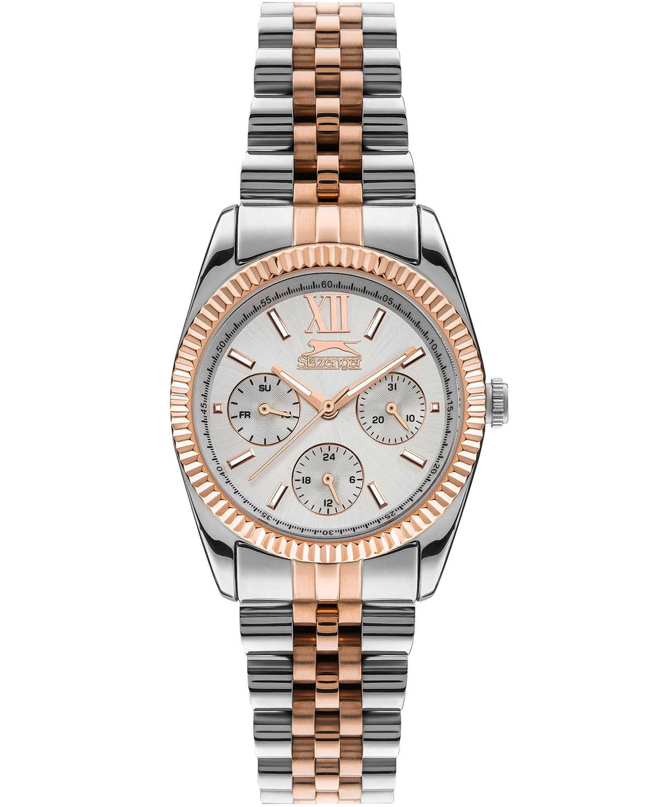 Женские элегантные наручные часы Slazenger SL.09.6556.4.04 сочетают в себе современный стиль и функциональность. Стильный корпус выполнен из суперметалла с неповортоным безелемБезельВнешний ободок, закрепляющий стекло. В спортивных часах так называется поворотное кольцо с делениями на циферблате, выполняет роль таймера – замеряет отрезки времени на шкале. Неподвижный безель – элемент декора. Однонаправленно вращающийся безель на дайверских часах позволяет фиксировать моменты погружения и выныривания на поверхность. с IP-покрытиемIP-покрытиеМетод ионного напыления. Демонстрирует повышенную устойчивость к истиранию, окислению и химическим веществам. Под воздействием высокого давления и температуры около 1500°C молекулы металла надёжно соединяются с частицами корпуса часов., придающий модели дополнительную прочность и элегантный внешний вид. Изысканный циферблат защищён минеральным стекломМинеральное стеклоМинеральное стекло представляет собой искусственно выращенный минерал кварца. Такое стекло отличается особой устойчивостью к повреждениям и царапинам. Уступает по некоторым качествам сапфировому стеклу., устойчивым к царапинам и повреждениям. Водонепроницаемость 3 АТМ позволяет использовать часы в повседневных условиях — при мытье рук или под лёгким дождём. Браслет из суперметалла с частичным IP-покрытиемIP-покрытиеМетод ионного напыления. Демонстрирует повышенную устойчивость к истиранию, окислению и химическим веществам. Под воздействием высокого давления и температуры около 1500°C молекулы металла надёжно соединяются с частицами корпуса часов. и с раскладной застёжкойРаскладная застёжкаТакой тип застёжки используется только на браслетах из металла. Она никогда не раскрывается полностью, происходит разделение на 2 и более частей. Раскладывающая застёжка снизит вероятность потери часов к минимуму., обеспечивающий надёжную фиксацию и комфорт при ношении. На отдельные циферблаты вынесены указатели 24-часового времени, даты и дня недели, что делает использование часов особенно удобным в повседневной жизни. Cтрелки и метки покрыты люминесцентным покрытиемЛюминесцентное покрытиеПозволяет считывать показания времени в темноте. Производители наносят на стрелки, часовые индексы, безель или поверхность циферблата светонакопительный состав, дающий холодное свечение. для читаемости в условиях недостаточного освещения. Эта модель идеально подходит для женщин, ценящих стиль, функциональность и надёжность в одном аксессуаре.