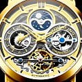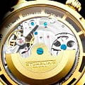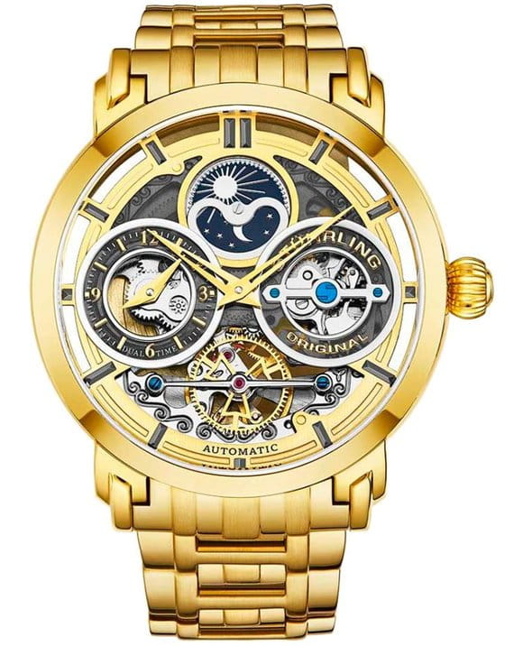 Мужские наручные часы Stührling Original 371B.03 из коллекции Luciano Automatic Skeleton сочетают в себе классический дизайн и современные технологии . Модель оснащена механическим механизмом с автоподзаводом, что гарантирует точность хода без необходимости ручного завода . Корпус часов диаметром 47 мм изготовлен из нержавеющей стали с PVD-покрытиемPVDУльтратонкое покрытие наносится в технике вакуумного напыления, сочетает в себе нитрид титана особой прочности со слоем золота или оксида хрома. Несёт в себе декоративную или защитную функцию. под золото, что подчеркивает элегантность модели . Защиту циферблата обеспечивает прочное стекло KrysternaKrysternaKrysterna — инновационное стекло для наручных часов. Благодаря уникальной структуре, Krysterna объединяет ключевые преимущества двух материалов: твердость сапфира, защищающую от царапин, и гибкость минерального стекла, обеспечивающую устойчивость к деформациям. Такая комбинация делает его идеальным решением для часов, подверженных экстремальным нагрузкам, сохраняя при этом оптическую прозрачность., известное своей устойчивостью к царапинам и механическим повреждениям . Циферблат выполнен в стиле , что позволяет наблюдать за работой внутреннего механизма и демонстрирует сложность инженерного решения . Такой дизайн делает модель не только функциональной, но и стильной, привлекая внимание ценителей сложных технических решений. Браслет из того же материала на раскладной застёжкеРаскладная застёжкаТакой тип застёжки используется только на браслетах из металла. Она никогда не раскрывается полностью, происходит разделение на 2 и более частей. Раскладывающая застёжка снизит вероятность потери часов к минимуму.. Водонепроницаемость модели достигает 5 атмосфер (50 метров), что позволяет использовать их в повседневных условиях, включая контакт с водой, например, при мытье рук или дожде . Заводная головка с системой завинчивания обеспечивает дополнительную защиту механизма от внешних воздействий.