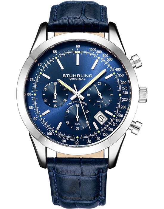 Stuhrling 3975L.2 — стильные мужские часы с выразительным пилотским дизайном и мощным функционалом. Классический циферблат дополнен контрастными счётчиками хронографаХронографФункция позволяет измерять отрезки времени с особой точностью: часы, минуты, секунды. Верным признаком хронографа является наличие на циферблате 3 дополнительных окошек-счётчиков., тахиметрической шкалой по ободу и аккуратным окошком даты, подчёркивающими технический характер модели. Корпус из нержавеющей стали придаёт часам надёжность и современный блеск, а стекло KrysternaKrysternaKrysterna — инновационное стекло для наручных часов. Благодаря уникальной структуре, Krysterna объединяет ключевые преимущества двух материалов: твердость сапфира, защищающую от царапин, и гибкость минерального стекла, обеспечивающую устойчивость к деформациям. Такая комбинация делает его идеальным решением для часов, подверженных экстремальным нагрузкам, сохраняя при этом оптическую прозрачность. защищает поверхность от царапин и сохраняет кристальную прозрачность. Кожаный ремень с классической текстурой аллигатора и стандартной застежкой, обеспечивает комфорт и элегантную посадку на запястье. Stuhrling — гармония силы, точности и изысканного стиля для мужчин, ценящих уверенность и безупречный вкус.