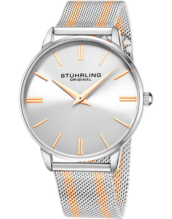 Stuhrling 3998.4 — элегантные мужские часы, объединяющие строгую классику и современную функциональность. Корпус из нержавеющей стали создают ощущение монолитной надёжности, а глубокий циферблат придаёт модели выразительность и характер. Стальной браслет миланского плетения с PVD-покрытиемPVDУльтратонкое покрытие наносится в технике вакуумного напыления, сочетает в себе нитрид титана особой прочности со слоем золота или оксида хрома. Несёт в себе декоративную или защитную функцию. на раскладном замкеРаскладной замокДанный вариант застежки используется только на часах с металлическим браслетом. Отличительная особенность такого крепления в том, что длина браслета становится универсальной и вы можете самостоятельно отрегулировать нужный вам размер – застежка просто двигается по браслету часов.. Прочное стекло KrysternaKrysternaKrysterna — инновационное стекло для наручных часов. Благодаря уникальной структуре, Krysterna объединяет ключевые преимущества двух материалов: твердость сапфира, защищающую от царапин, и гибкость минерального стекла, обеспечивающую устойчивость к деформациям. Такая комбинация делает его идеальным решением для часов, подверженных экстремальным нагрузкам, сохраняя при этом оптическую прозрачность. защищает циферблат от царапин, а надёжный кварцевый механизм гарантирует стабильную точность. Stuhrling — выбор уверенного мужчины, ценящего сочетание функциональности, лаконичного дизайна и безупречной отделки.