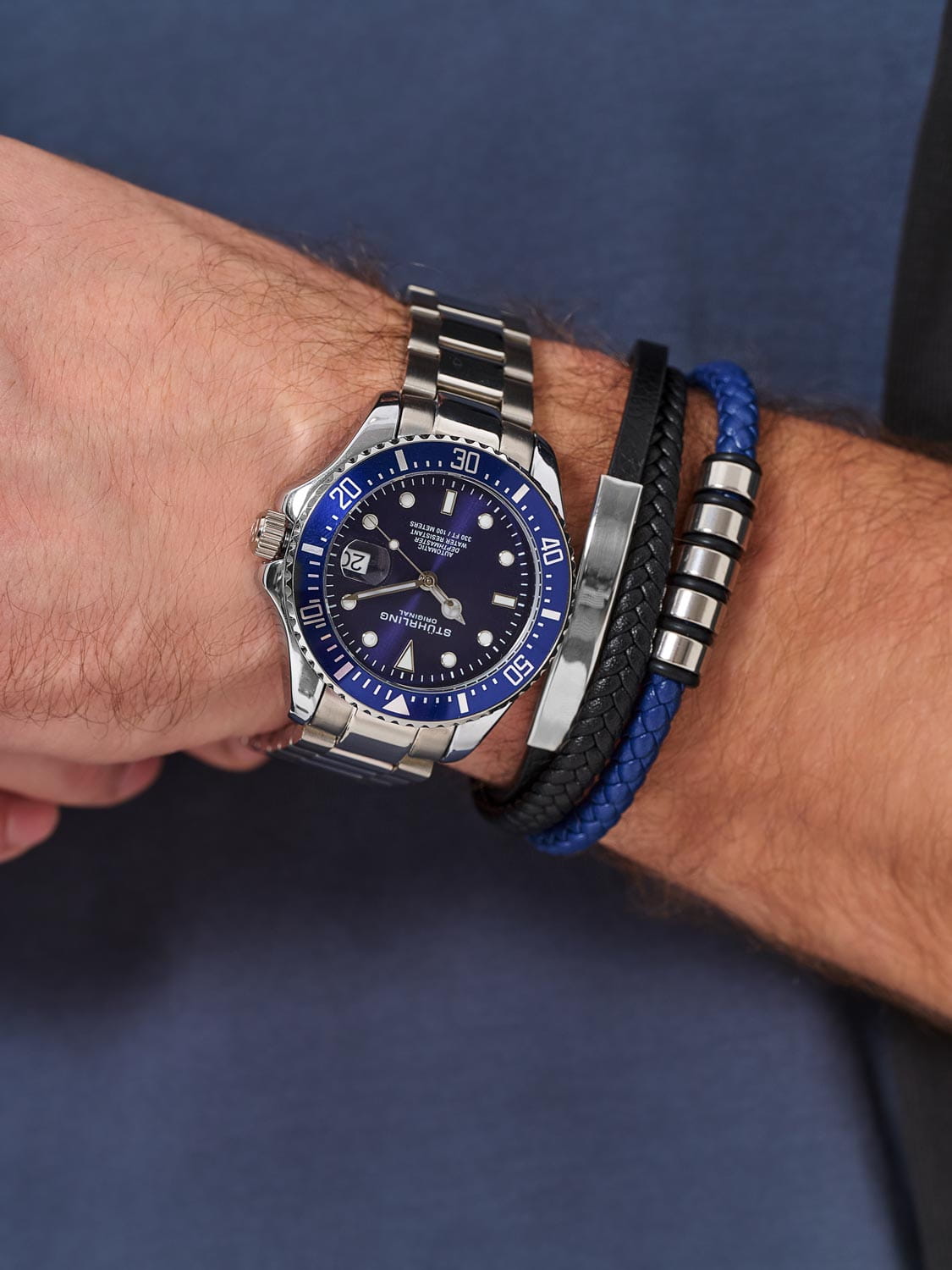 Stuhrling 4048.3 — стильные мужские часы в духе морского дайверского дизайна. Глубокий циферблат с радиальным переливом и крупные метки/стрелки с люминесцентным покрытиемЛюминесцентное покрытиеПозволяет считывать показания времени в темноте. Производители наносят на стрелки, часовые индексы, безель или поверхность циферблата светонакопительный состав, дающий холодное свечение. обеспечивают отличную читаемость, вращающийся безельБезельВнешний ободок, закрепляющий стекло. В спортивных часах так называется поворотное кольцо с делениями на циферблате, выполняет роль таймера – замеряет отрезки времени на шкале. Неподвижный безель – элемент декора. Однонаправленно вращающийся безель на дайверских часах позволяет фиксировать моменты погружения и выныривания на поверхность. с PVD-покрытиемPVDУльтратонкое покрытие наносится в технике вакуумного напыления, сочетает в себе нитрид титана особой прочности со слоем золота или оксида хрома. Несёт в себе декоративную или защитную функцию. подчёркивает спортивный характер. Браслет из нержавеющей стали, удобная раскладная застёжкаРаскладная застёжкаТакой тип застёжки используется только на браслетах из металла. Она никогда не раскрывается полностью, происходит разделение на 2 и более частей. Раскладывающая застёжка снизит вероятность потери часов к минимуму. фиксирует часы на запястье. Циферблат прикрыт стеклом KrysternaKrysternaKrysterna — инновационное стекло для наручных часов. Благодаря уникальной структуре, Krysterna объединяет ключевые преимущества двух материалов: твердость сапфира, защищающую от царапин, и гибкость минерального стекла, обеспечивающую устойчивость к деформациям. Такая комбинация делает его идеальным решением для часов, подверженных экстремальным нагрузкам, сохраняя при этом оптическую прозрачность. с высокой стойкостью к царапинам. Надёжный спутник для повседневной настроения и активного отдыха.