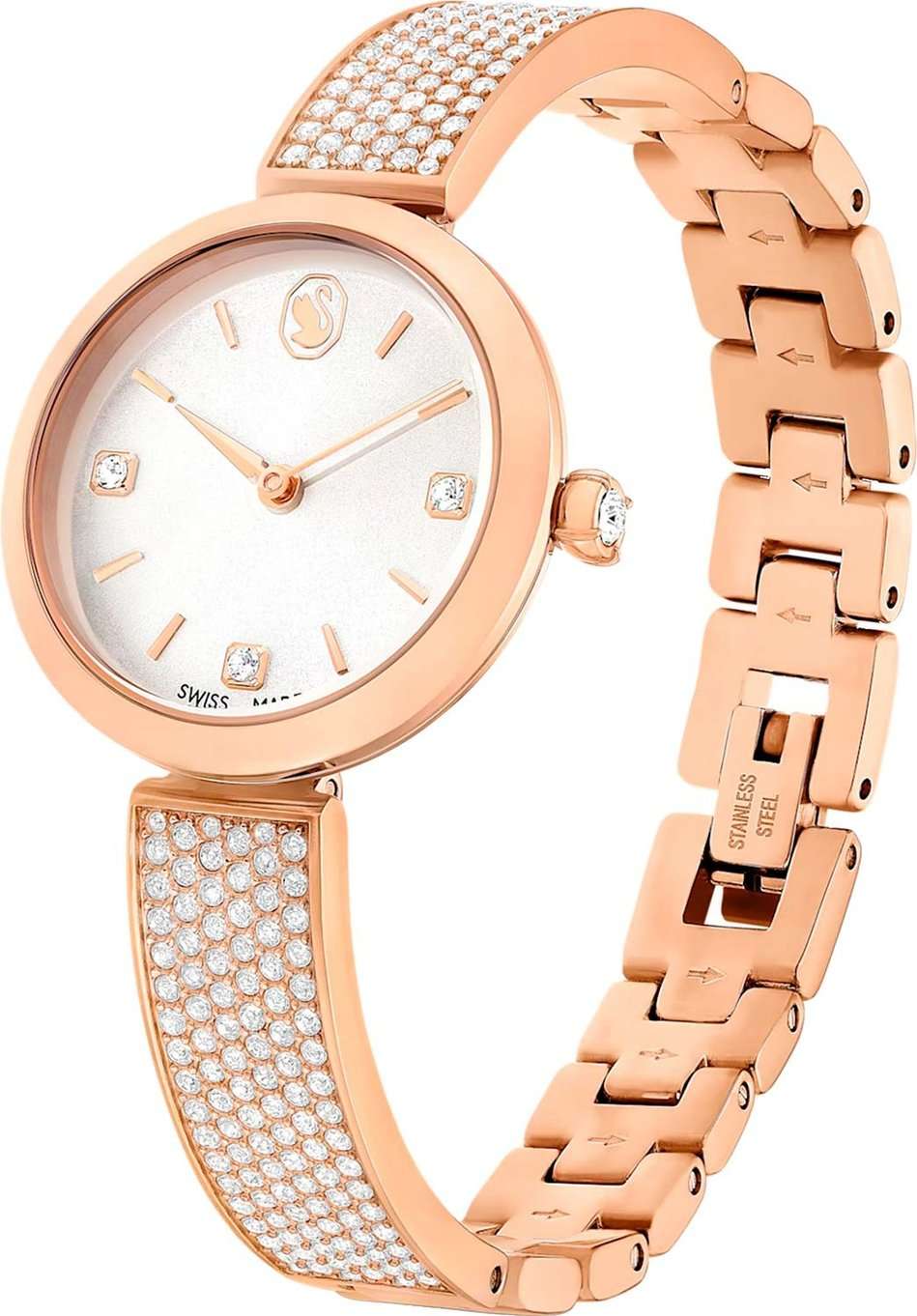 Часы Swarovski 5671202 – это воплощение изысканного дизайна и функциональности, созданное для тех, кто ценит красоту и точность. Произведенные в Швейцарии, эти кварцевые часы представлены в элегантном корпусе с безелемБезельВнешний ободок, закрепляющий стекло. В спортивных часах так называется поворотное кольцо с делениями на циферблате, выполняет роль таймера – замеряет отрезки времени на шкале. Неподвижный безель – элемент декора. Однонаправленно вращающийся безель на дайверских часах позволяет фиксировать моменты погружения и выныривания на поверхность. из нержавеющей стали с розовым PVDPVDУльтратонкое покрытие наносится в технике вакуумного напыления, сочетает в себе нитрид титана особой прочности со слоем золота или оксида хрома. Несёт в себе декоративную или защитную функцию. покрытием. Под минеральным стекломМинеральное стеклоМинеральное стекло представляет собой искусственно выращенный минерал кварца. Такое стекло отличается особой устойчивостью к повреждениям и царапинам. Уступает по некоторым качествам сапфировому стеклу. открывается белый циферблат с изящным узором Sunray, дополненный логотипом Swarovski в виде лебедя на 12 часах и кристаллами на отметках 3, 6 и 9 часов. Отсутствие секундной стрелки подчеркивает минимализм и утонченность дизайна. Заводная головка украшена кристаллом круглой огранки, добавляющим блеска и завершенности образу. Стальной браслет с розовым PVDPVDУльтратонкое покрытие наносится в технике вакуумного напыления, сочетает в себе нитрид титана особой прочности со слоем золота или оксида хрома. Несёт в себе декоративную или защитную функцию. покрытием декорирован прозрачными кристаллами Swarovski, создающими неповторимый мерцающий эффект, а ювелирная застежка обеспечивает надежность и комфорт. Водозащита 50WR делает их устойчивыми к влаге, позволяя наслаждаться стильным аксессуаром в любых условиях.