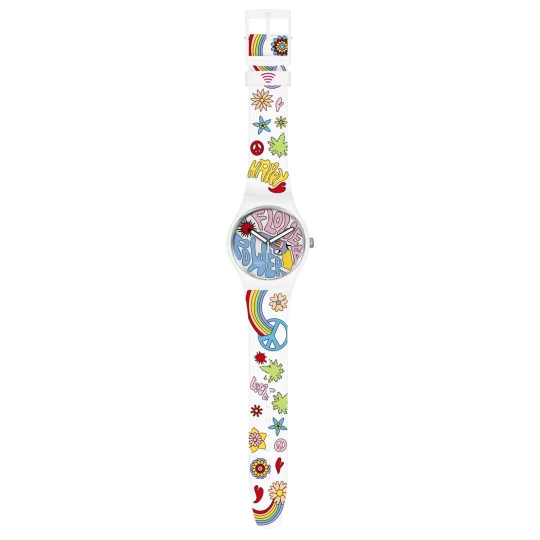 Часы Swatch New Gent Bioceramic Swatch Pay! SO32W108-5300 — это стильный и универсальный аксессуар, подходящий как для мужчин, так и для женщин. Часы поддерживают функцию бесконтактной оплаты SwatchPAY!. Часы PEACEPAY! отличаются белым циферблатом с разноцветным дизайном фразы "Flower Power". Они имеют белые часовую, минутную и секундную стрелки. Корпус изготовлен из биокерамики. Модель вдохновлена стилем 60-х годов, символизирующим мир и любовь. Эти часы сочетают в себе ретро-эстетику с современными материалами, создавая уникальный и яркий аксессуар. Модель отличается круглым корпусом диаметром 41 мм и толщиной 9 мм, выполненным из прочного пластика белого цвета. Стрелки с люминесцентным покрытиемЛюминесцентное покрытиеПозволяет считывать показания времени в темноте. Производители наносят на стрелки, часовые индексы, безель или поверхность циферблата светонакопительный состав, дающий холодное свечение.. Часы оснащены кварцевым механизмом, обеспечивающим точное измерение времени. Стекло из плексигласа защищает циферблат от царапин и повреждений. Ремешок выполнен из силикона, что обеспечивает комфорт при носке. Водонепроницаемость 3 бар позволяет не беспокоиться о случайных брызгах или кратковременном погружении в воду. Модель SO32W108-5300 не имеет функции отображения даты, что придает циферблату минималистичный и чистый вид. Эти часы станут ярким акцентом в любом образе. Они идеально подойдут как для повседневной носки, так и для особых случаев, привлекая внимание своим необычным цветовым решением и современным дизайном.