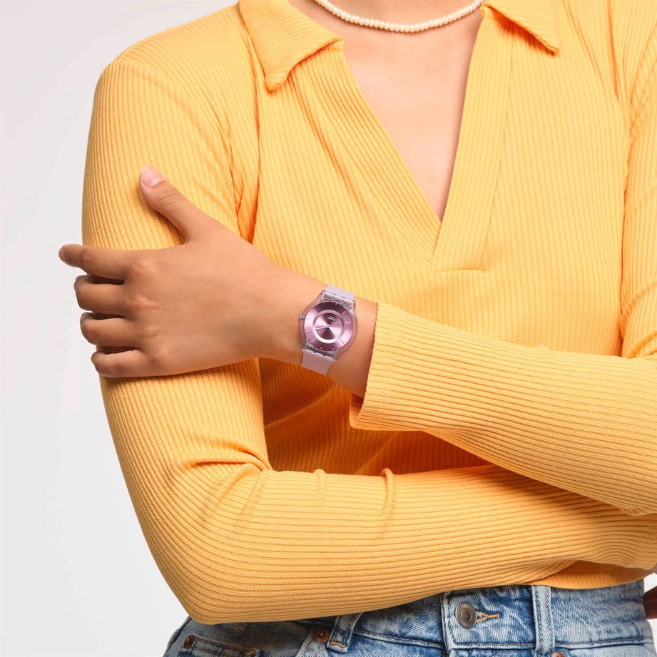 Часы Swatch SS08V100-S14 — это стильный и современный аксессуар для тех, кто ценит лёгкость и комфорт. Часы идеально подойдут как для мужчин, так и для женщин. Циферблат этих ультратонких часов имеет розовато-сиреневый оттенок и отделан радиальной полировкой. На его фоне контрастно выделяется бирюзовый принт с логотипом Swatch и такие же стрелки. Модель заключена в корпус из биоматериала. Ремешок, тренчик и пряжка имеют схожую с циферблатом расцветку. Водозащита 30 метров делает часы практичными для повседневного использования. Эти часы подойдут для повседневного ношения и станут ярким акцентом в вашем наряде.
