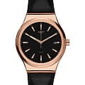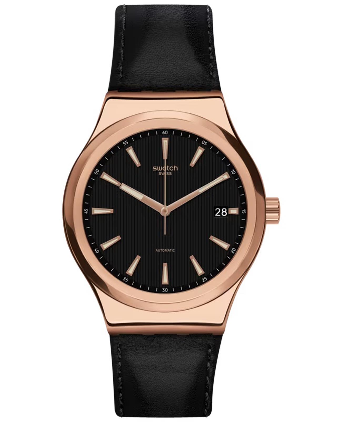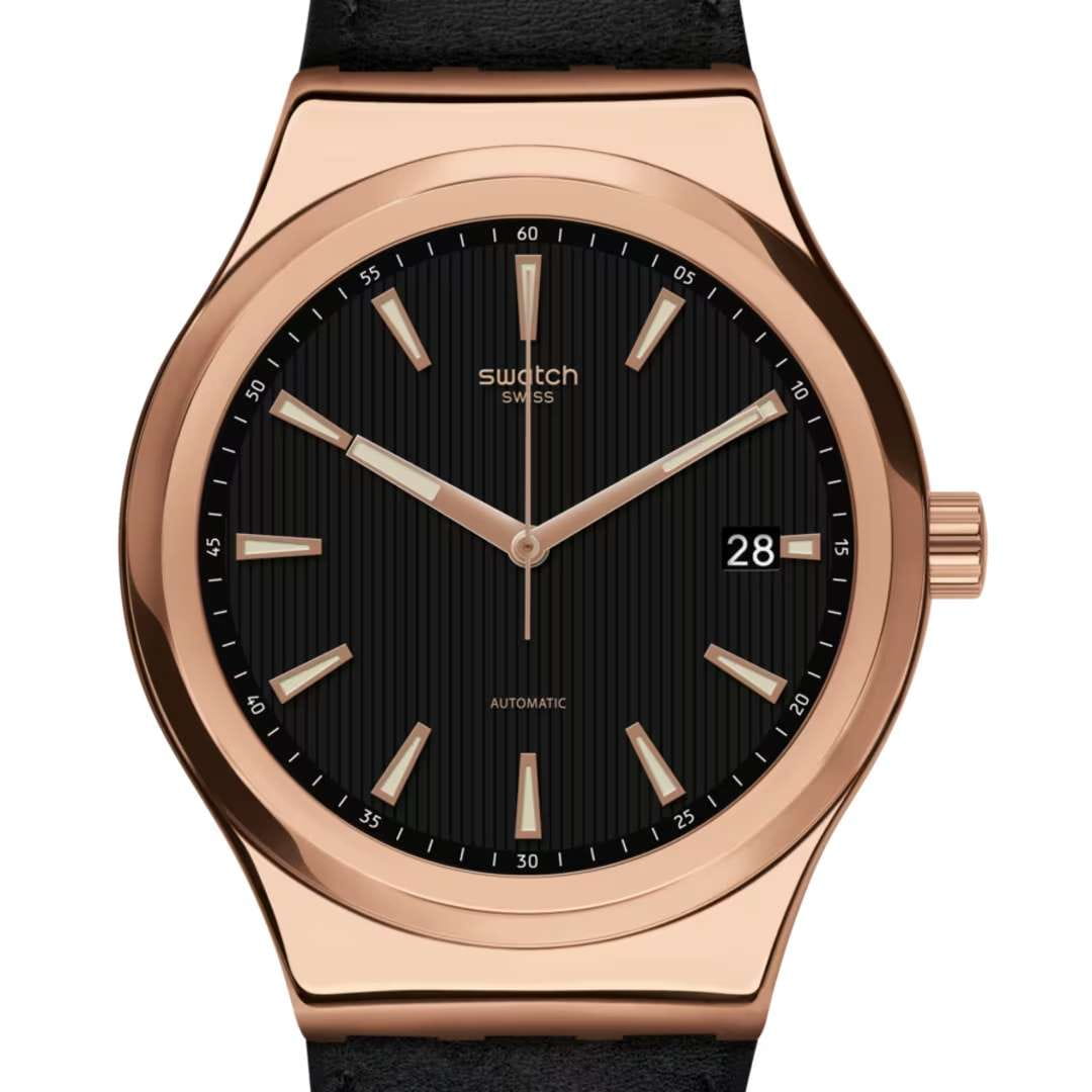 Часы Swatch SISTEM ROSEE YIG400 — это элегантная механическая модель с золотистым акцентом. Они оснащены черным циферблатом из нержавеющей стали с PVD-покрытиемPVDУльтратонкое покрытие наносится в технике вакуумного напыления, сочетает в себе нитрид титана особой прочности со слоем золота или оксида хрома. Несёт в себе декоративную или защитную функцию. цвета розового золота и кожаным ремешком на классической застежке. Стрелки с люминесцентным покрытиемЛюминесцентное покрытиеПозволяет считывать показания времени в темноте. Производители наносят на стрелки, часовые индексы, безель или поверхность циферблата светонакопительный состав, дающий холодное свечение.. Модель оснащена автоматическим механизмом Sistem51, который состоит всего из 51 детали и имеет запас хода 90 часов.  Особенностью часов является прозрачная задняя крышка, позволяющая наблюдать за работой механизма. Часы водонепроницаемы до 3 бар. Часы Swatch YIG400 принадлежит к коллекции Sistem51, которая революционизировала мир автоматических часов благодаря полностью автоматизированному процессу производства и исключительным антимагнитным свойствам.