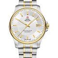 Корпус и стекло: Корпус диаметром 39 мм выполнен из нержавеющей стали с двухцветным PVD-покрытиемPVDУльтратонкое покрытие наносится в технике вакуумного напыления, сочетает в себе нитрид титана особой прочности со слоем золота или оксида хрома. Несёт в себе декоративную или защитную функцию. (биколор), что придаёт часам стильный и утончённый вид. Сапфировое стеклоСапфировое стеклоПрочный и надёжный материал из кристалла сапфира синтетического происхождения, характеризующийся особой твёрдостью и устойчивостью к царапинам и повреждениям. защищает циферблат, обеспечивая стойкость к царапинам.