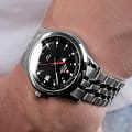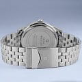 Кварцевый механизм с высокой точностью. Минеральное стеклоМинеральное стеклоМинеральное стекло представляет собой искусственно выращенный минерал кварца. Такое стекло отличается особой устойчивостью к повреждениям и царапинам. Уступает по некоторым качествам сапфировому стеклу. устойчивое к появлению царапин, обладающее высокой прозрачностью. Стрелки и метки с люминесцентным покрытиемЛюминесцентное покрытиеПозволяет считывать показания времени в темноте. Производители наносят на стрелки, часовые индексы, безель или поверхность циферблата светонакопительный состав, дающий холодное свечение.. Класс водозащиты: 50 метров, позволит защитить корпус от случайных брызг или капель дождя. Корпус часов изготовлен из нержавеющей стали. Браслет с раскладной застёжкойРаскладная застёжкаТакой тип застёжки используется только на браслетах из металла. Она никогда не раскрывается полностью, происходит разделение на 2 и более частей. Раскладывающая застёжка снизит вероятность потери часов к минимуму..
