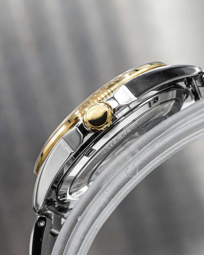 Мужские швейцарские наручные часы Swiss Military by Chrono SMA34085.39, механический механизм (автоматический калибр) с высокой точностью. Сапфировое стеклоСапфировое стеклоПрочный и надёжный материал из кристалла сапфира синтетического происхождения, характеризующийся особой твёрдостью и устойчивостью к царапинам и повреждениям. устойчивое к появлению царапин, обладающее высокой прозрачностью. Класс водозащиты: 100 метров, позволит плавать, нырять и заниматься другими водными видами спорта. Корпус часов изготовлен из стали с частичным PVD-покрытиемPVDУльтратонкое покрытие наносится в технике вакуумного напыления, сочетает в себе нитрид титана особой прочности со слоем золота или оксида хрома. Несёт в себе декоративную или защитную функцию., цвета желтое золото. Люминесцентная подсветкаЛюминесцентное покрытиеПозволяет считывать показания времени в темноте. Производители наносят на стрелки, часовые индексы, безель или поверхность циферблата светонакопительный состав, дающий холодное свечение. стрелок. Браслет с раскладной застёжкойРаскладная застёжкаТакой тип застёжки используется только на браслетах из металла. Она никогда не раскрывается полностью, происходит разделение на 2 и более частей. Раскладывающая застёжка снизит вероятность потери часов к минимуму..